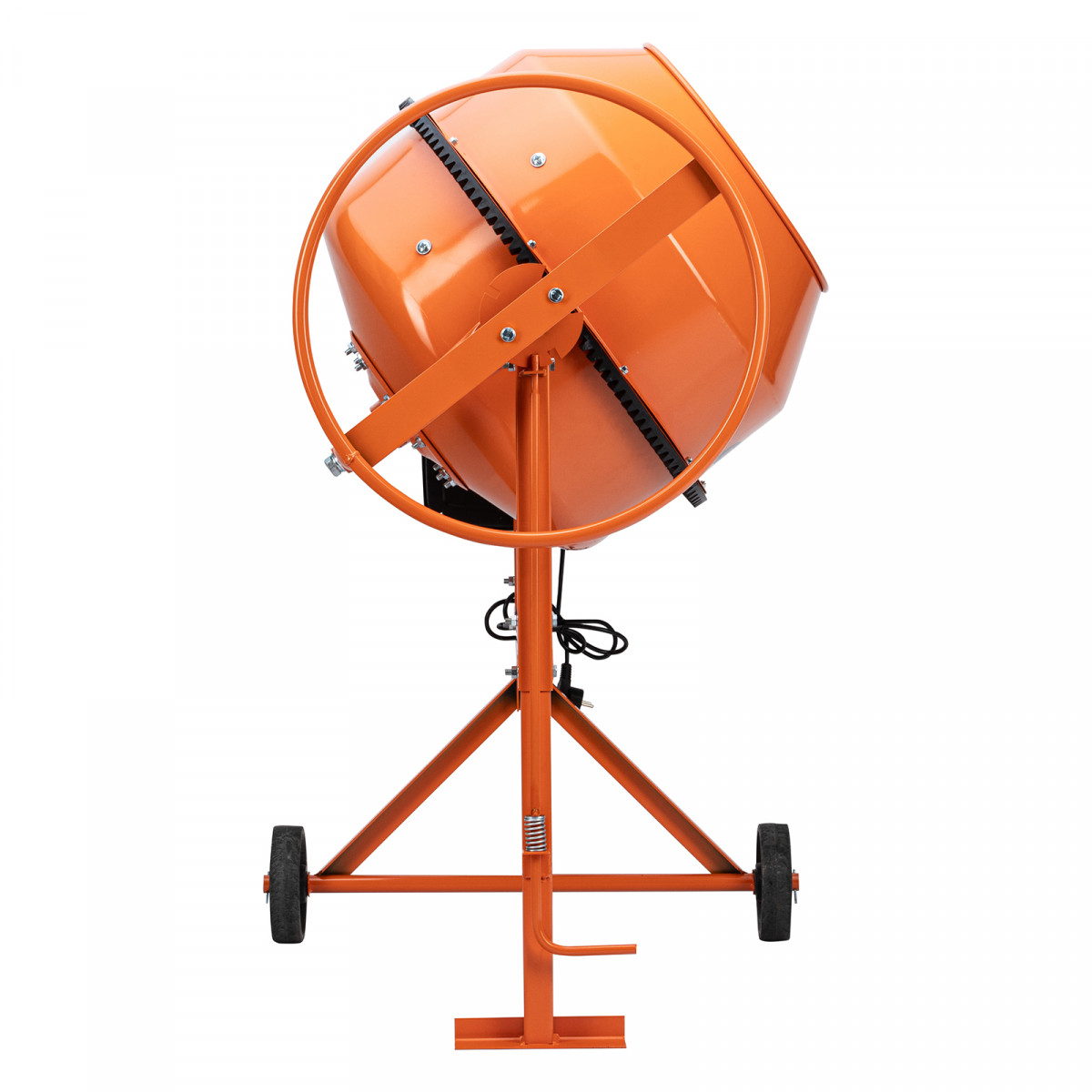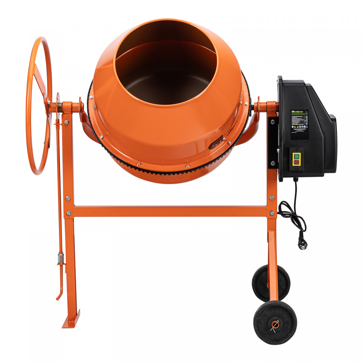 - Удобная загрузка и выгрузка смеси — барабан наклоняется при помощи маховика и легко фиксируется в нужном положении.