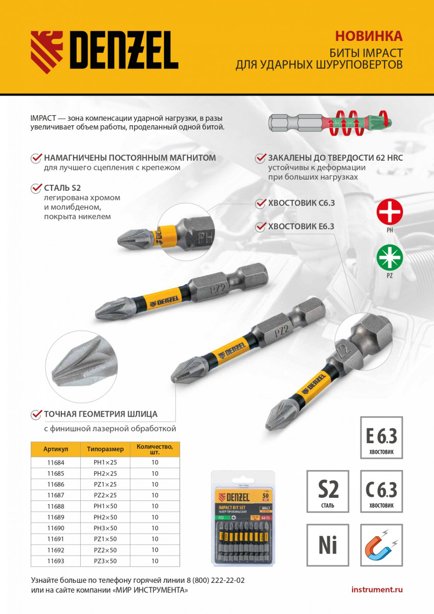 Бита IMPACT, PH1x25 мм, лазерная обработка шлица, сталь S2, 10 шт., Е 6,3 Denzel
