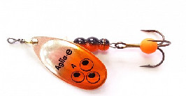 AGLIA TW — отличаются от базовой модели AGLIA двухцветной рефлекторной окраской лепестка и возможностью быстрой замены тройника. Грузик сердечника у AGLIA TW имеет внутреннюю резьбу с очень крупным шагом. Проволочная ось завершается колечком для крючка, сопряженным с пружинной шпилькой. Находясь в теле груза, пружинная шпилька упирается в уступ крупной резьбы. В данном случае шестигранный грузик служит винтовым замочком. Освобождение шпильки осуществляется простым свинчиванием груза, а возвратная фиксация — вдавливанием шпильки в его тело. Это простой, но очень надежный узел крепления (не разрушается даже при значительных нагрузках). AGLIA TW — настоящий клад для любителей экспериментов на водоемах. Рыболов получает возможность быстро укомплектовать вращалку пластиковой рыбкой, виброхвостом, твистером или просто тройником с мухой подходящего цвета.