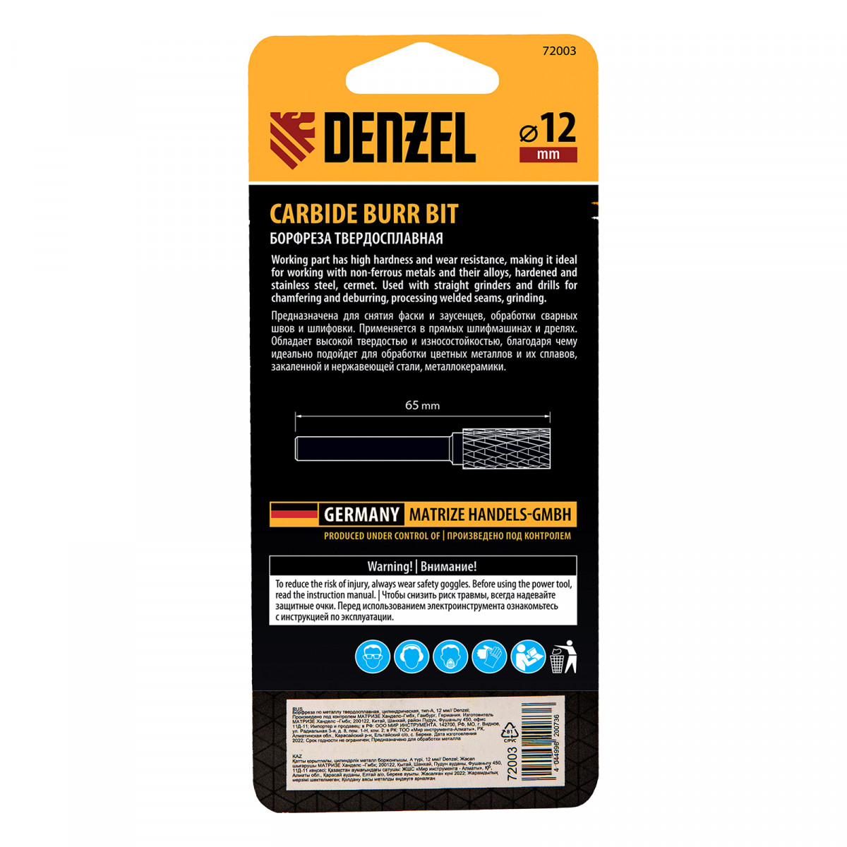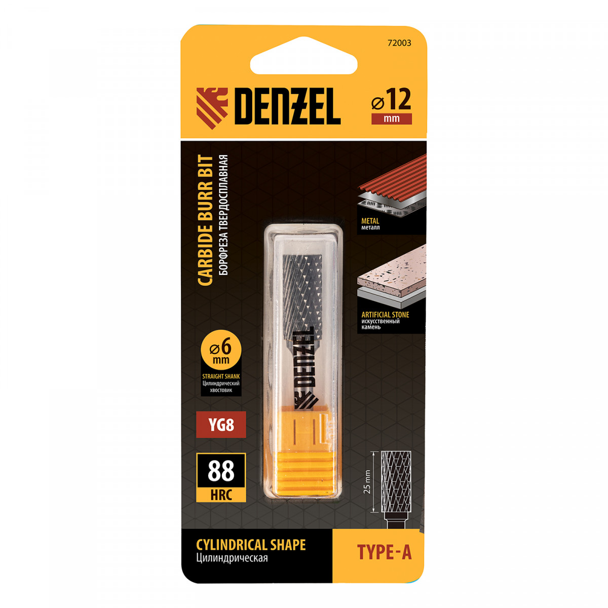 Твердосплавная борфреза Denzel 72003 с цилиндрической рабочей частью (тип A), диаметром 12 мм, используется для работ по металлу (закаленной и нержавеющей стали, латуни, меди, бронзе, чугуну, титану). Подходит также для обработки искусственного камня и металлокерамики. Предназначена для завершающей обработки и подгонки форм и поверхностей: шлифовки, зачистки сварных швов, удаления заусенцев, снятия фасок, разделки кромок. Оснастка устанавливается на прямошлифовальную машину или дрель.