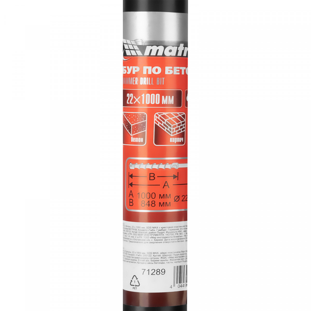Бур по бетону Matrix 71289 размером 22 х 1000 мм используется в качестве оснастки на тяжелых перфораторах с хвостовиком SDS MAX. Подходит для сверления глубоких отверстий в кирпиче и особо прочных материалах: армированном бетоне, природном и искусственном камне.
