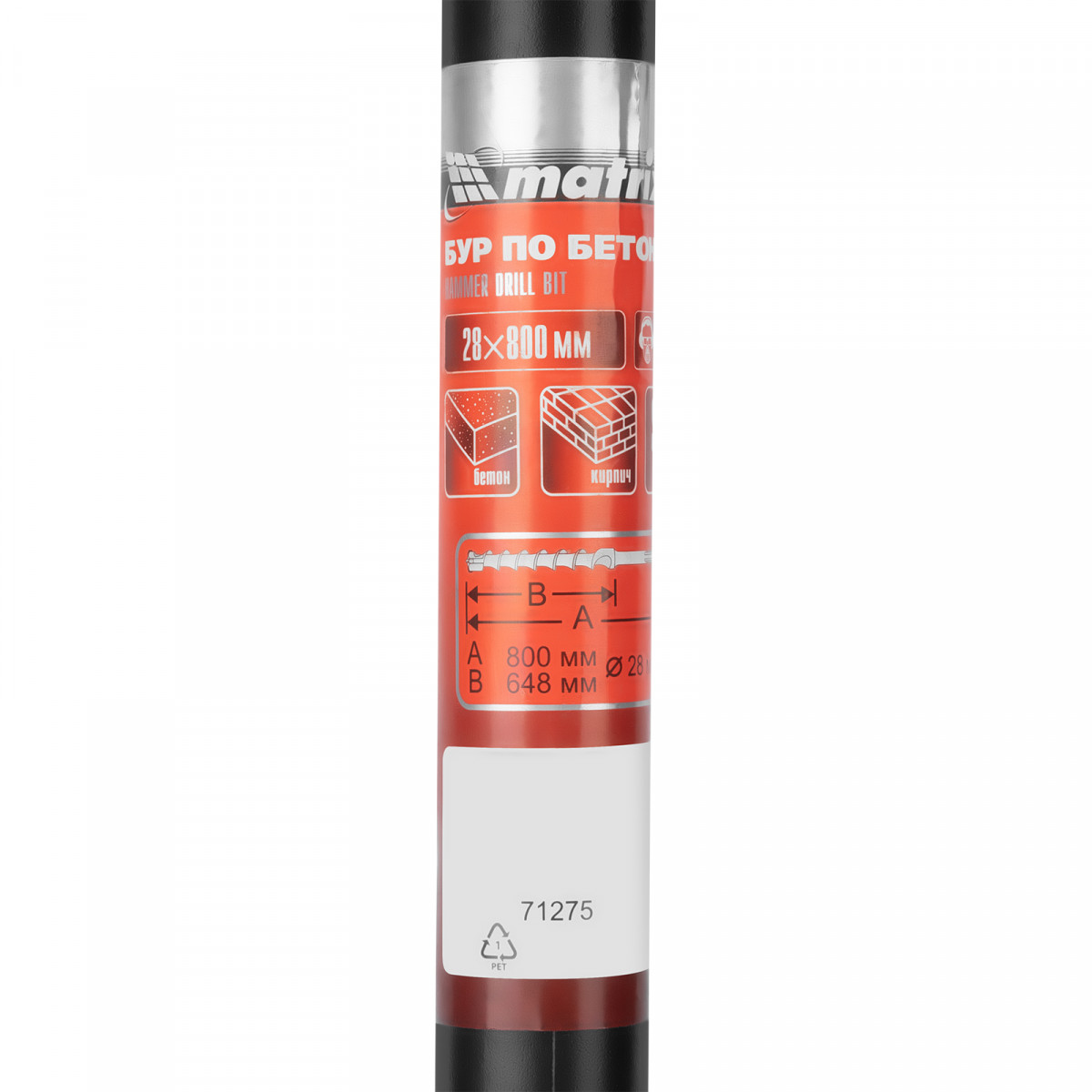 Бур по бетону Matrix 71275 размером 28 х 800 мм используется в качестве оснастки на тяжелых перфораторах с хвостовиком SDS MAX. Подходит для сверления глубоких отверстий в кирпиче и особо прочных материалах: армированном бетоне, природном и искусственном камне.