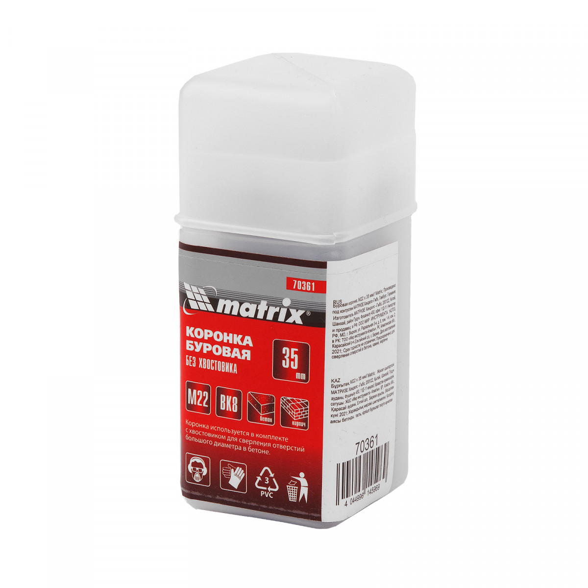 Буровая коронка M22 х 35 мм Matrix 70361 рассчитана на сверление отверстий в бетоне, кирпиче, граните, природном и искусственном камне. Устанавливается на ударные дрели или перфораторы с патронами под хвостовик SDS-Plus или SDS-Max. Коронка позволяет получить большие отверстия, поэтому пригодится для монтажа розеток, выключателей и прокладки труб.