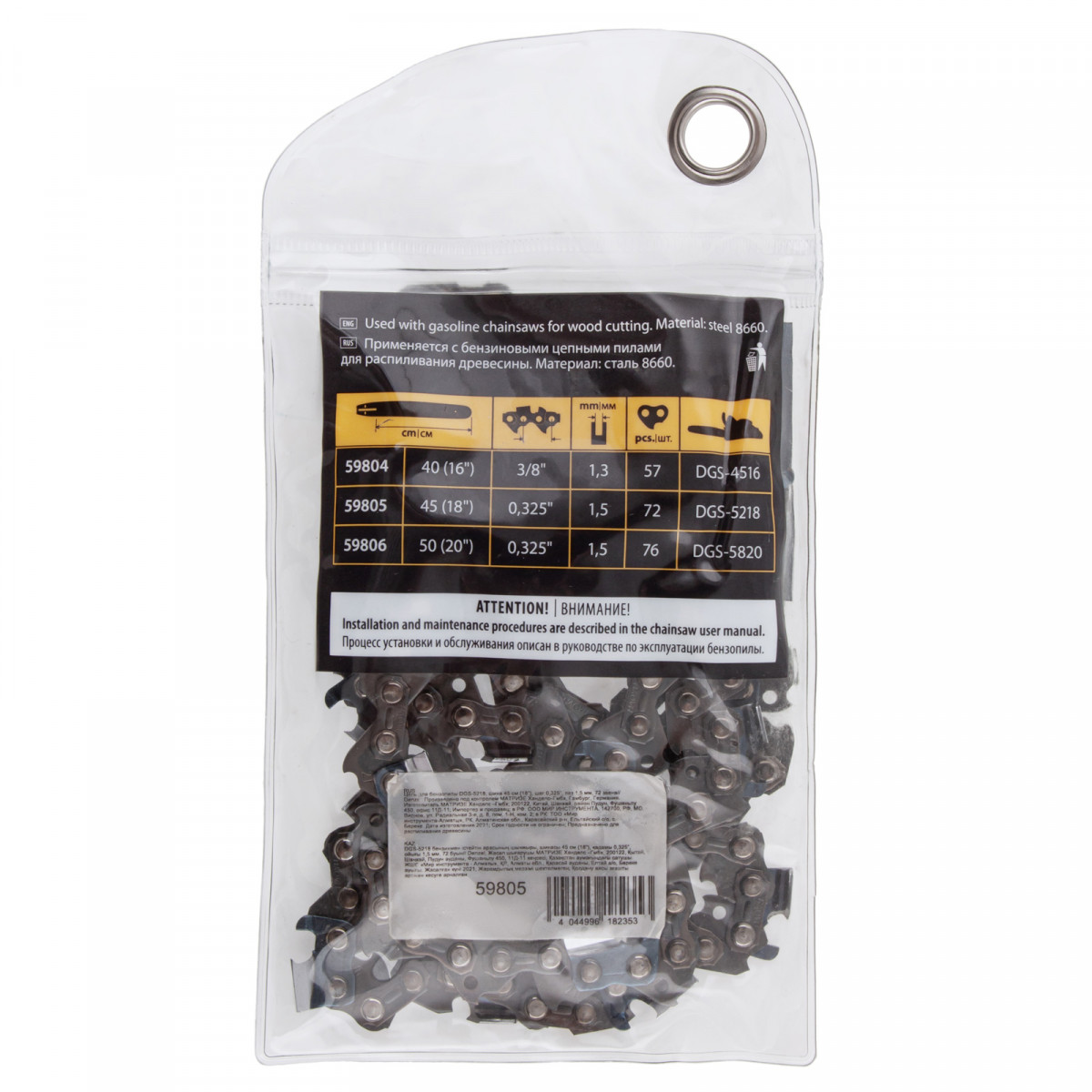 • Безопасное хранение и транспортировка — защитная упаковка предотвращает контакт с острыми звеньями.