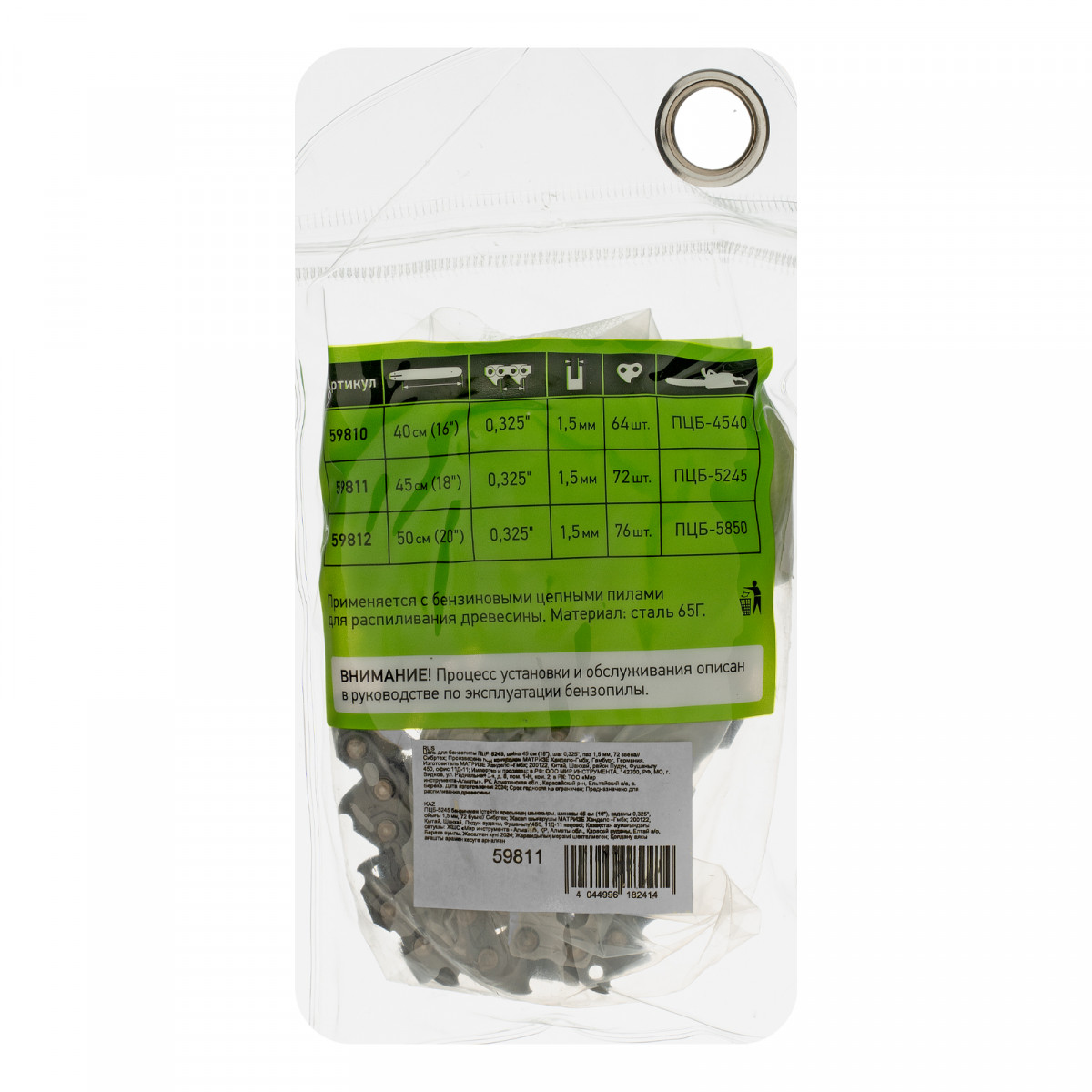 Цепь Сибртех 59811 с шириной паза 1,5 мм используется с бензопилой ПЦБ-5245, состоит из 72 звеньев с шагом 0,325″ и надевается на пильную шину длиной 45 см (18″). Оптимальна для частного применения в бытовых условиях, на небольших стройках, в лесу, на рыбалке и в походах. Благодаря низкому уровню вибраций пилу с установленной цепью удобно удерживать в руках.