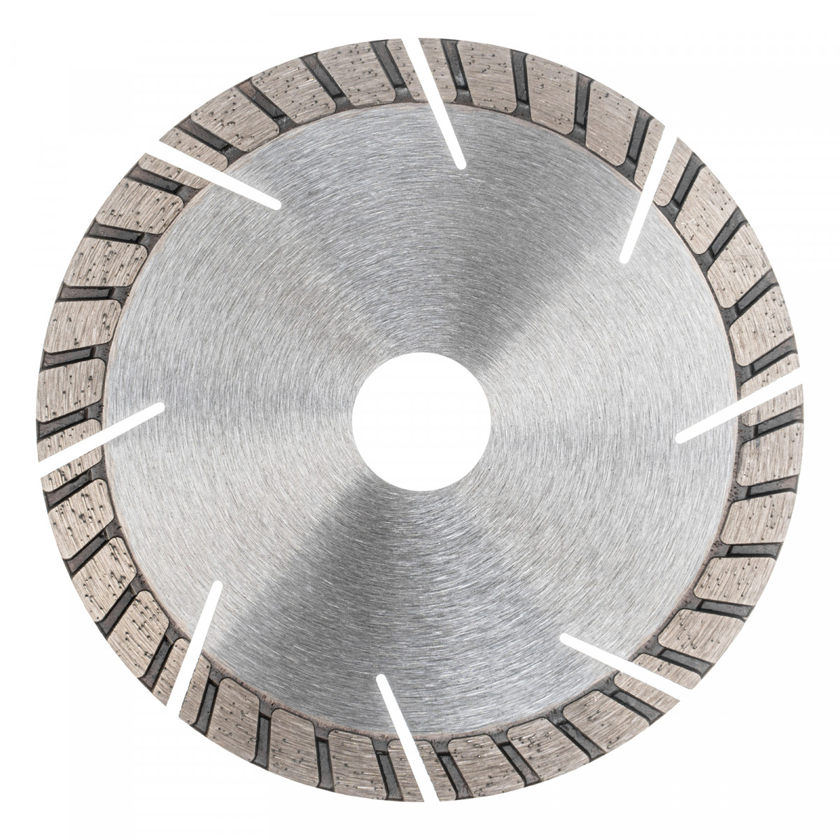 - Эффективная работа — благодаря турбо-сегментной форме диск быстро режет материалы, в т.ч. армированный бетон, водяное охлаждение не требуется.