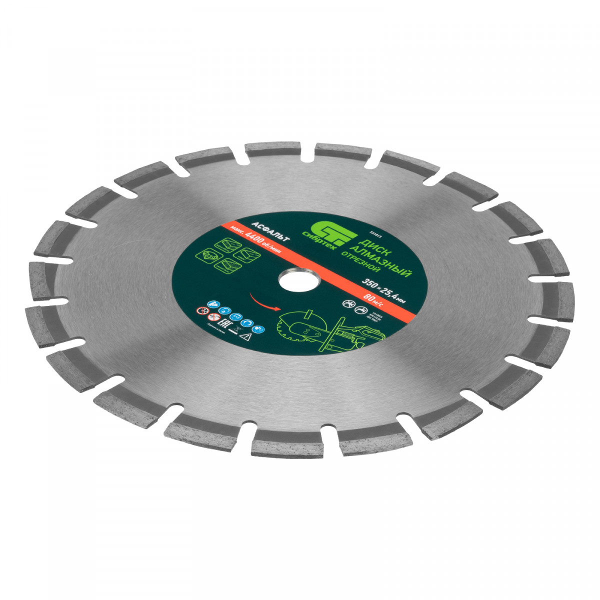 Алмазный диск Сибртех «Асфальт» 731013 диаметром 350 х 25,4 мм используется для сухого и мокрого реза асфальта, свежего бетона, асфальтобетона, камня, кирпича, абразивных материалов. Устанавливается на ручной бензорез или швонарезчик с посадочным диаметром 25,4 мм. Диск устойчив к деформациям и выдерживает значительные нагрузки. Для увеличения ресурса диска рекомендуется проводить мокрое резание.