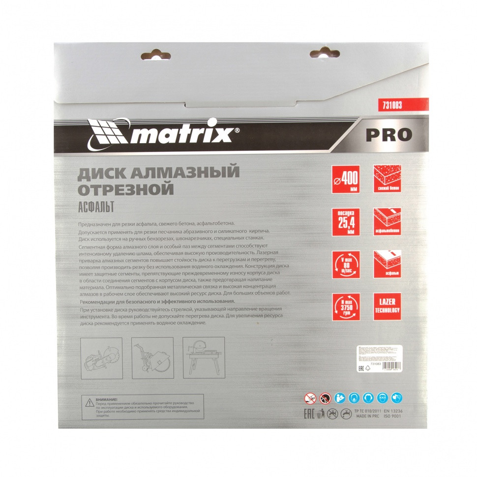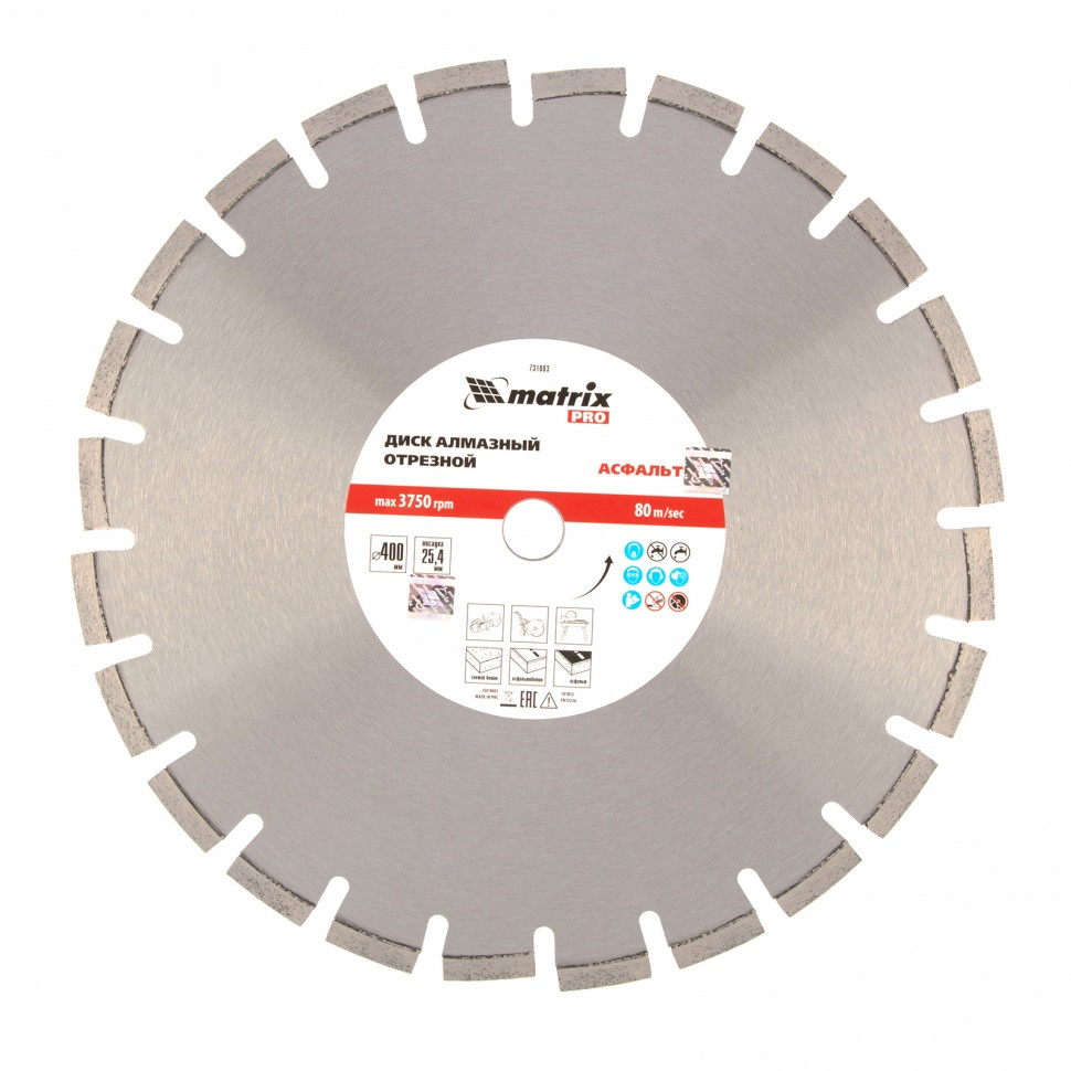 Алмазный диск Matrix PRO «Асфальт» 731083 диаметром 400 х 25,4 мм используется для сухого и мокрого реза асфальта, свежего бетона, асфальтобетона, камня, кирпича, абразивных материалов. Устанавливается на ручной бензорез или швонарезчик с посадочным диаметром 25,4 мм. Диск устойчив к деформациям и выдерживает значительные нагрузки. Для увеличения ресурса диска рекомендуется проводить мокрое резание.