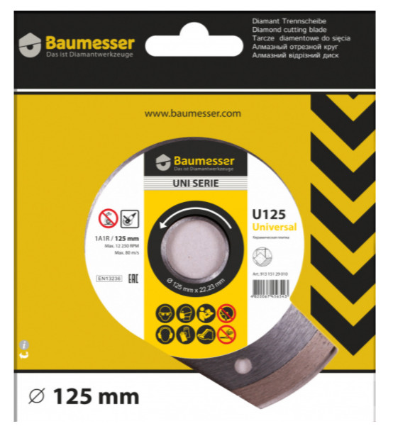 Алмазный круг Baumesser Universal 1A1R предназначен для обработки керамики, керамогранита и травертина. Диаметр диска равен 125 мм. Используется на базе угловых шлифовальных машин с посадочным отверстием 22,23 мм. Оборудован сплошной режущей кромкой высотой 8 мм и толщиной 1,4 мм. Применяется без подачи воды в рабочую зону (сухая резка).