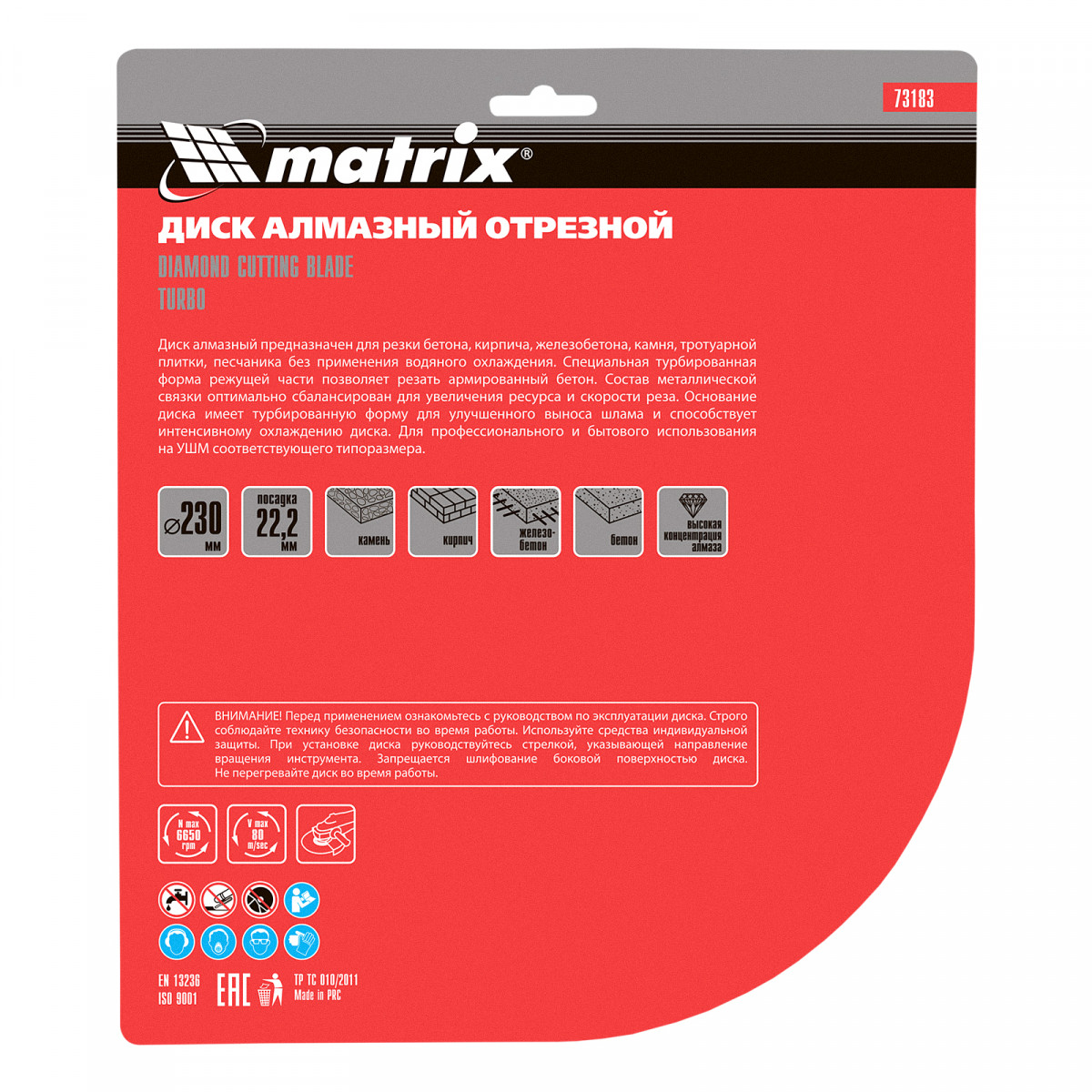 Отрезной алмазный диск Matrix Turbo 73183 диаметром 230 х 22,2 мм, предназначен для сухой резки. Используется в качестве сменной оснасткой для углошлифовальных машин (УШМ) во время ремонта и мелкого строительства, а также в быту. Позволяет работать по бетону, в том числе свежему и среднеармированному, камню и кирпичу.
