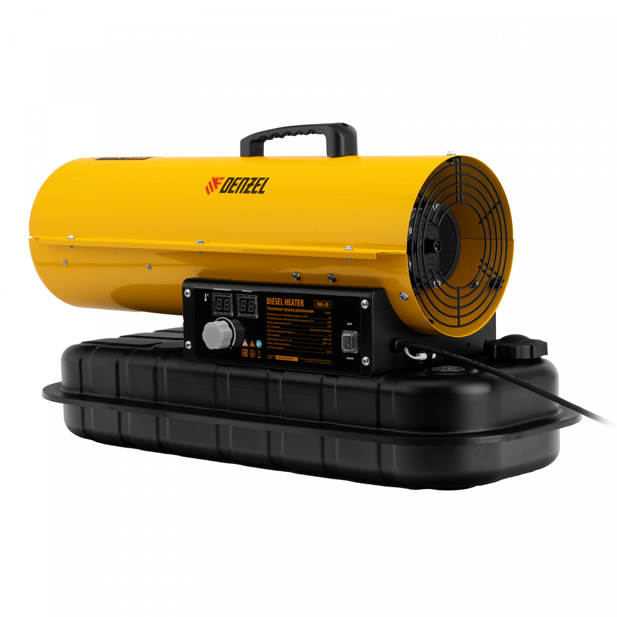 Дизельная тепловая пушка Denzel DHG-20 96482 мощностью 20 кВт и производительностью 500 куб. м/ч предназначена для прямого нагрева воздуха в цехах, ангарах, хранилищах и других нежилых помещениях с хорошей вентиляцией. Максимальная площадь обогрева составляет 200 кв. м. Пушка служит эффективным источником тепла в полярных экспедициях. Пригодится также на строительной площадке для прогрева бетона, просушки стен и разморозки траншей. Для заправки может использоваться любое дизельное топливо: летнее, зимнее и арктическое.