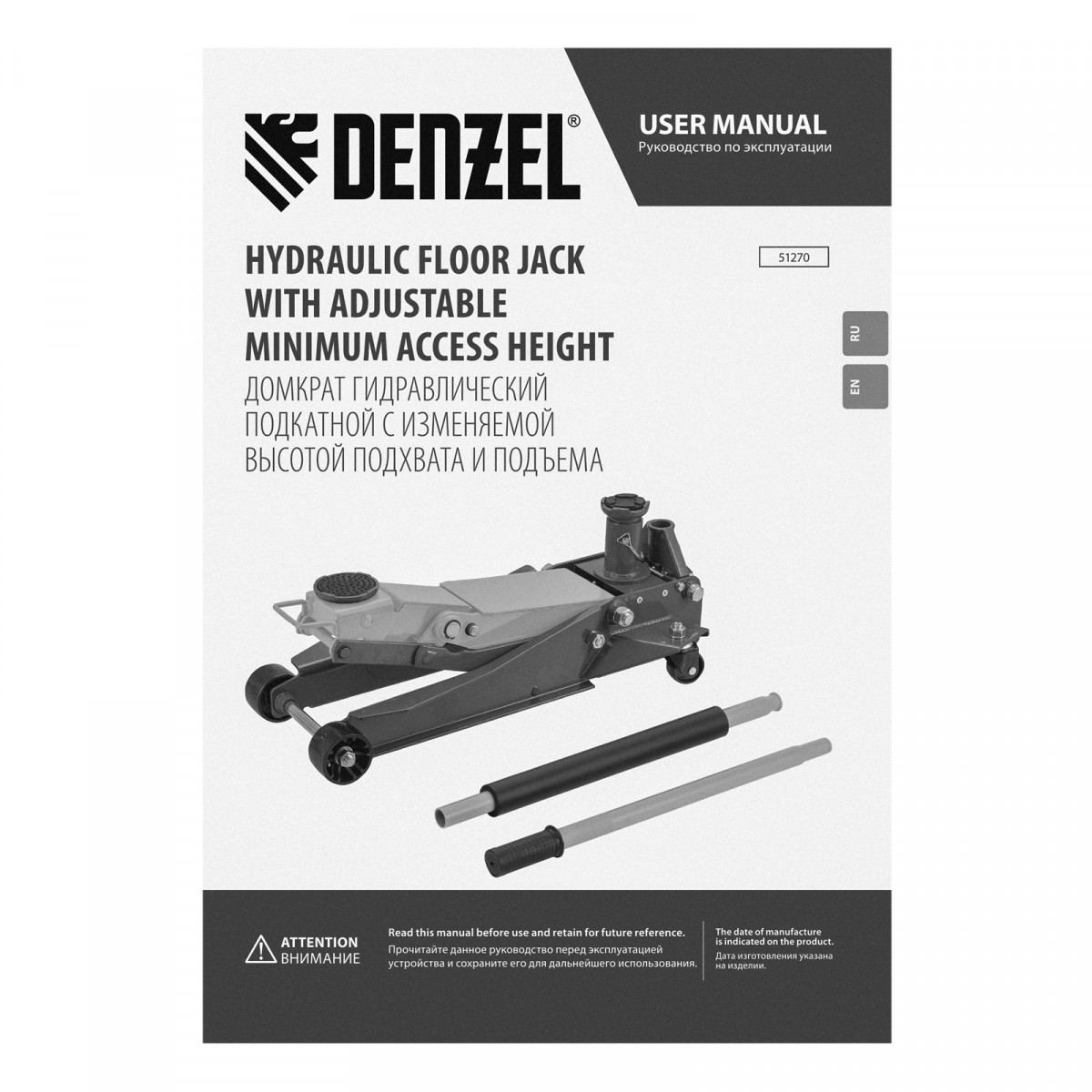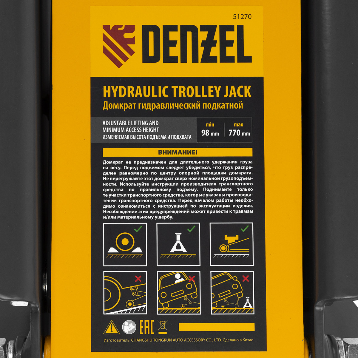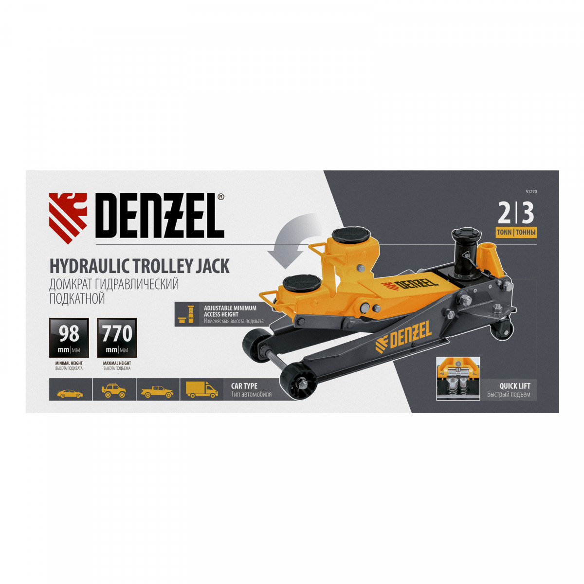 Профессиональный подкатной гидравлический домкрат Denzel 51270 с низким подхватом используется для быстрого подъема на высоту 98-770 мм всех типов автомобилей с любым клиренсом и массой до 2-3 т, в том числе SUV (внедорожников). Регулируемая проставка позволяет менять высоту подхвата и подъема, а также максимальную грузоподъемность. Высота подъема до 770 мм позволяет без труда обслуживать автомобили с высоким клиренсом, такие как рамные внедорожники, например, Dodge RAM, Ford Raptor и т.д.