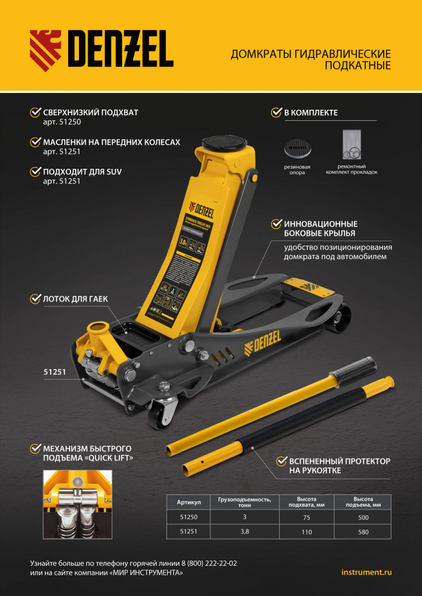 Профессиональный подкатной гидравлический домкрат Denzel 51251 с низким подхватом используется для быстрого подъема на высоту 110-580 мм всех типов автомобилей с любым клиренсом и массой до 3,8 т. Подходит для транспортных средство класса кроссоверов и внедорожников. Благодаря системе быстрого подъема QUICK LIFT для достижения предельной высоты достаточно 6 качков рукоятки. Домкрат подходит для использования на станциях техобслуживания и шиномонтажа.