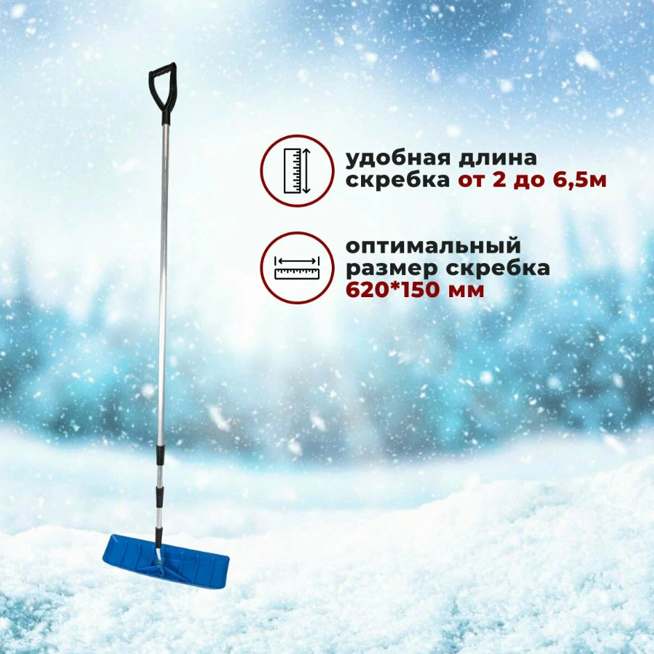Телескопическая ручка до 6,2 м обеспечивает доступ к труднодоступным местам для эффективной уборки снега с крыш.