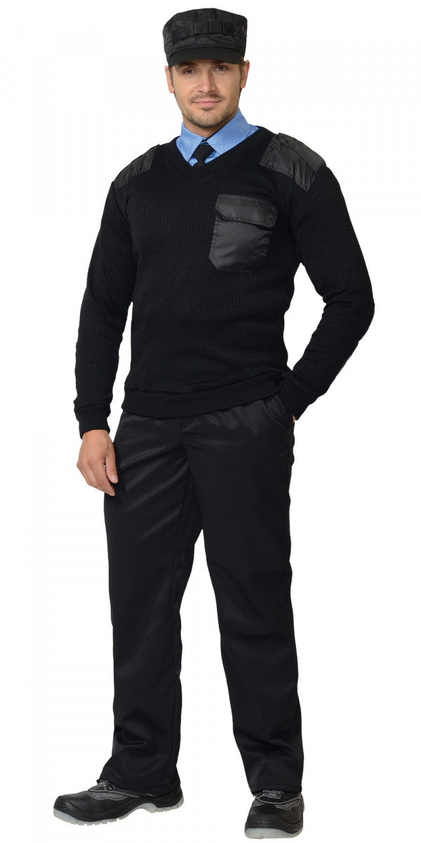 Джемпер форменный для сотрудников охранных предприятий с V-образным вырезом и с усилительными накладками в области плеч и локтей, а так же накладной карман и погоны из курточной ткани.