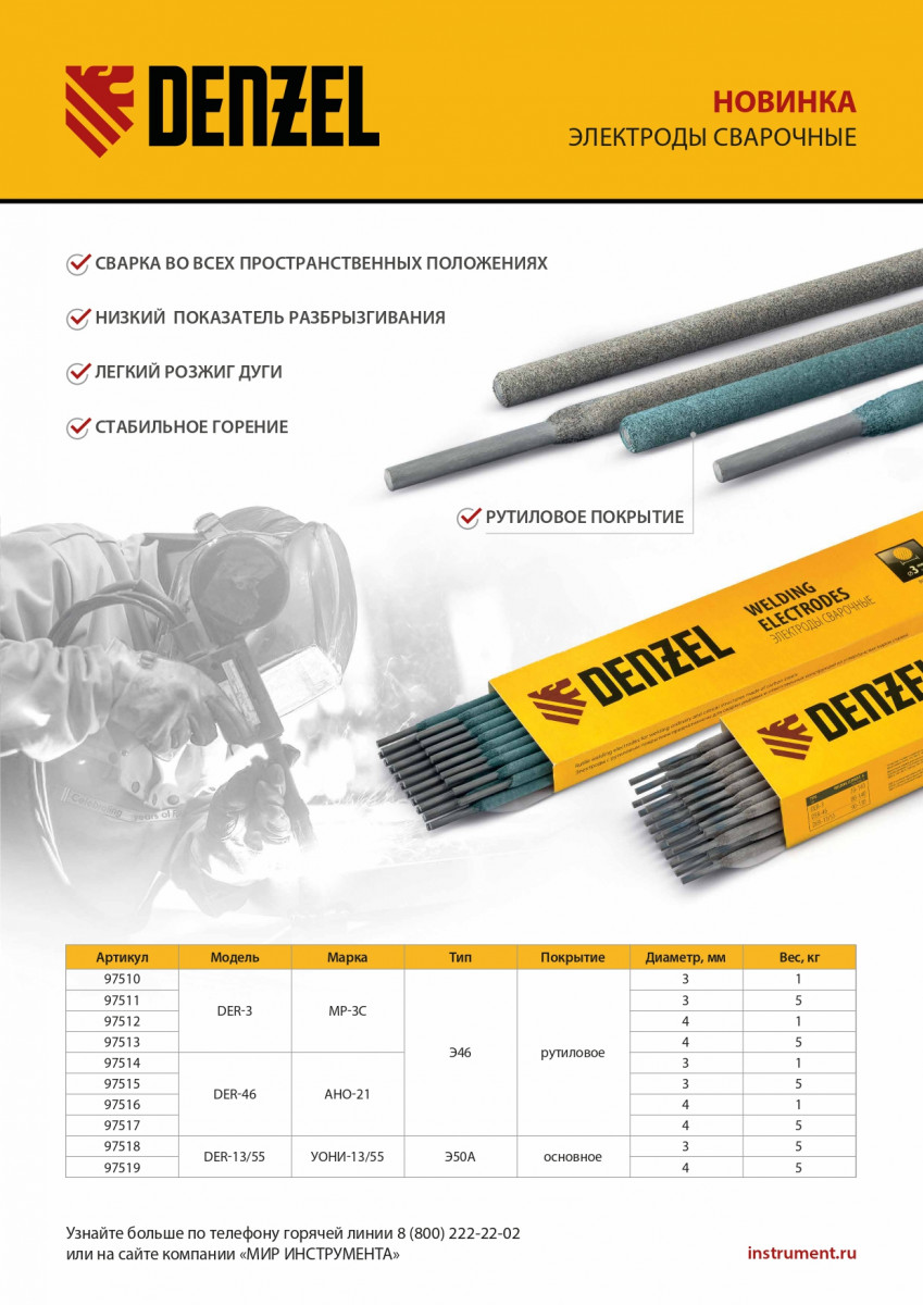 Электроды DER-46, диам. 4 мм, 5 кг, рутиловое покрытие Denzel