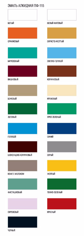 Цвет: Глянцевые эмали: белый, бежевый, кремовый, кофе с молоком, желтый, оранжевый, зеленый, ярко-зеленый, темно-зеленый, бирюзовый, светло-голубой, голубой, синий, сиреневый, красный, вишневый, коричневый, шоколадно-коричневый, серый, черный. Матовые эмали: белый.