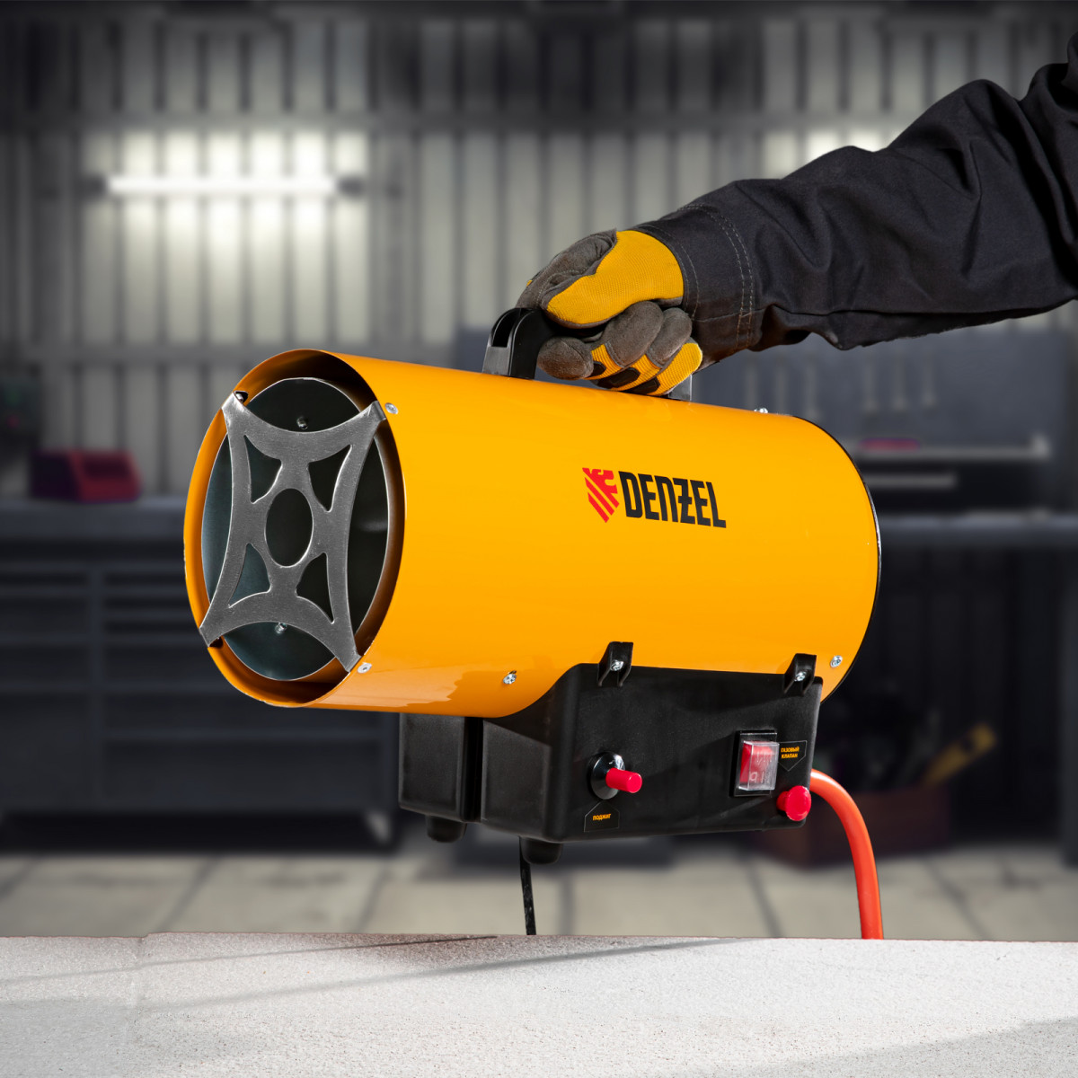 Газовая тепловая пушка Denzel GHG-15 96477 мощностью 15 кВт работает на смеси пропан-бутан и выдает тепловой поток со скоростью 500 куб. м/ч. Используется для обогрева складов, цехов, гаражей, теплиц и других нежилых помещений площадью до 150 кв. м. Будет полезна на строительных площадках и в производственных помещениях, а также для монтажа натяжных потолков.