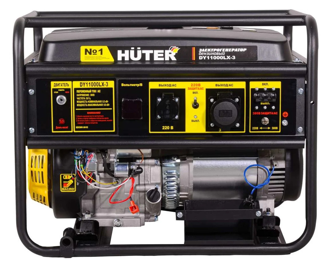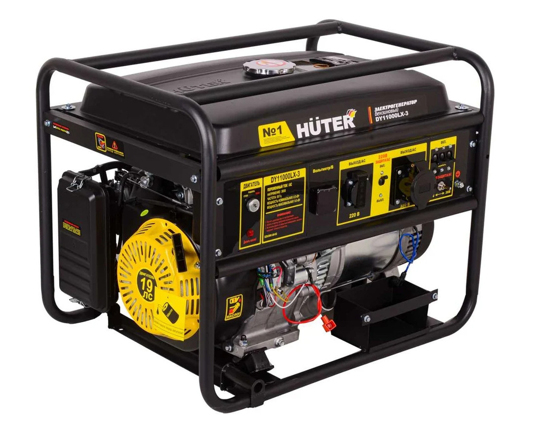 - Бензиновая электростанция Huter DY11000LX-3 оборудована мощным одноцилиндровым четырёхтактным двигателем внутреннего сгорания, мощностью 19 лс