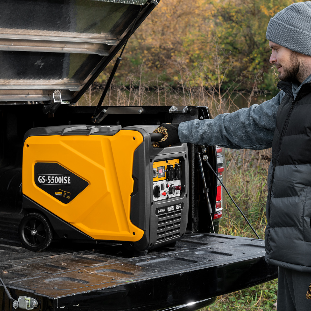 - Удобная транспортировка — колеса и телескопическая рукоятка облегчают перемещение генератора.