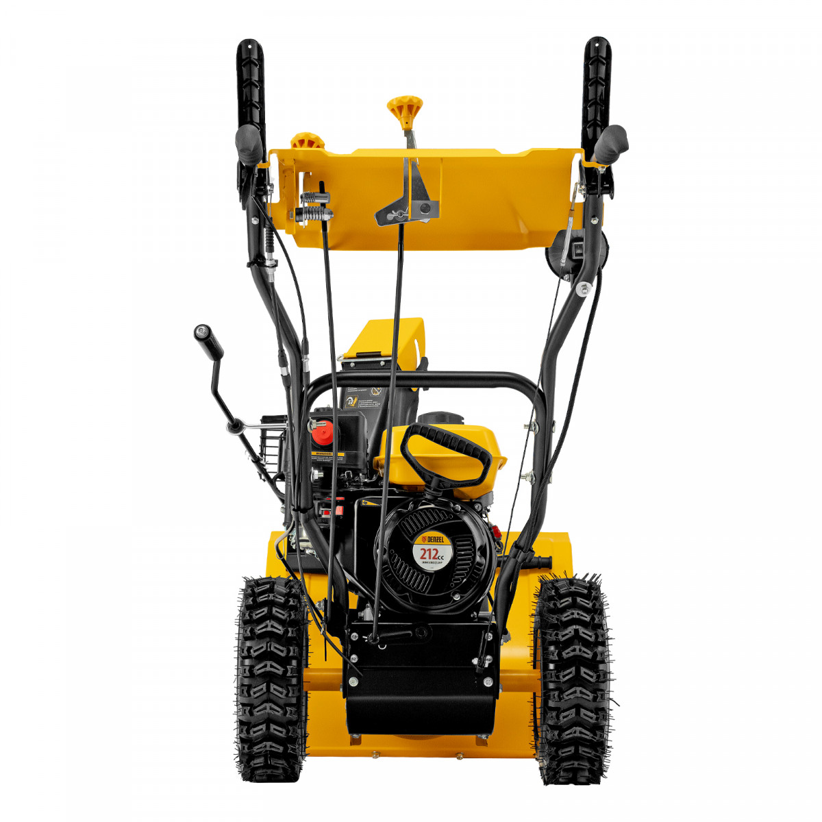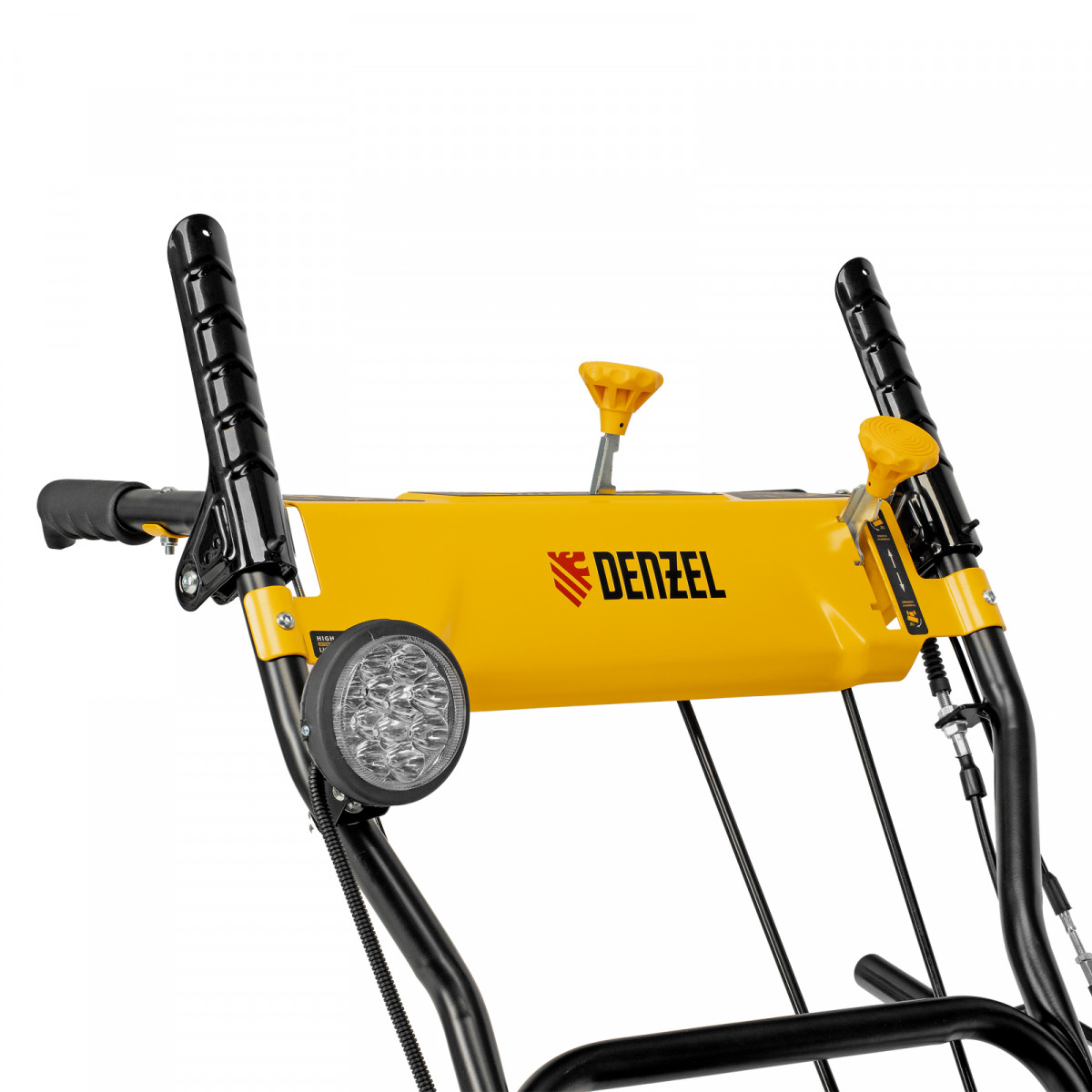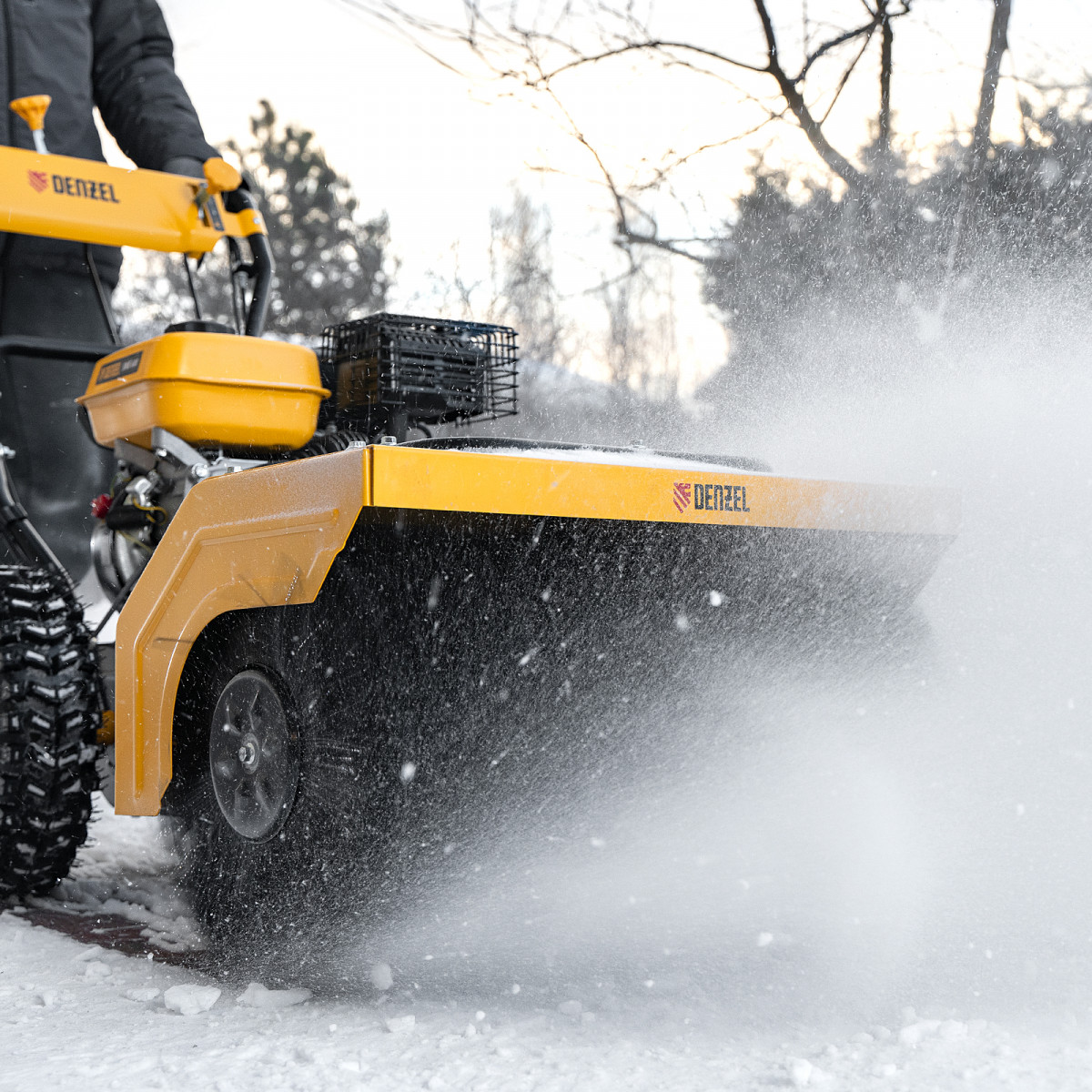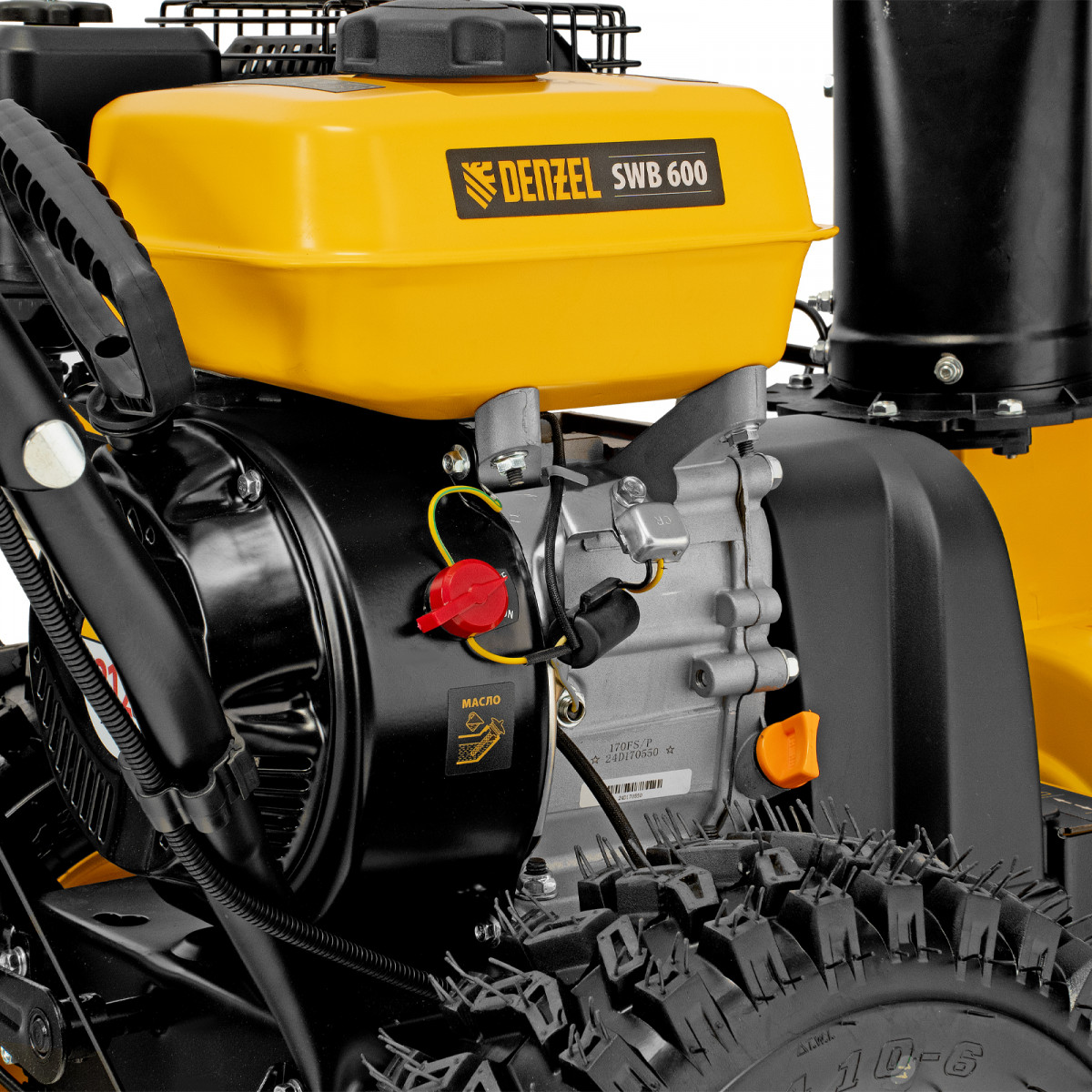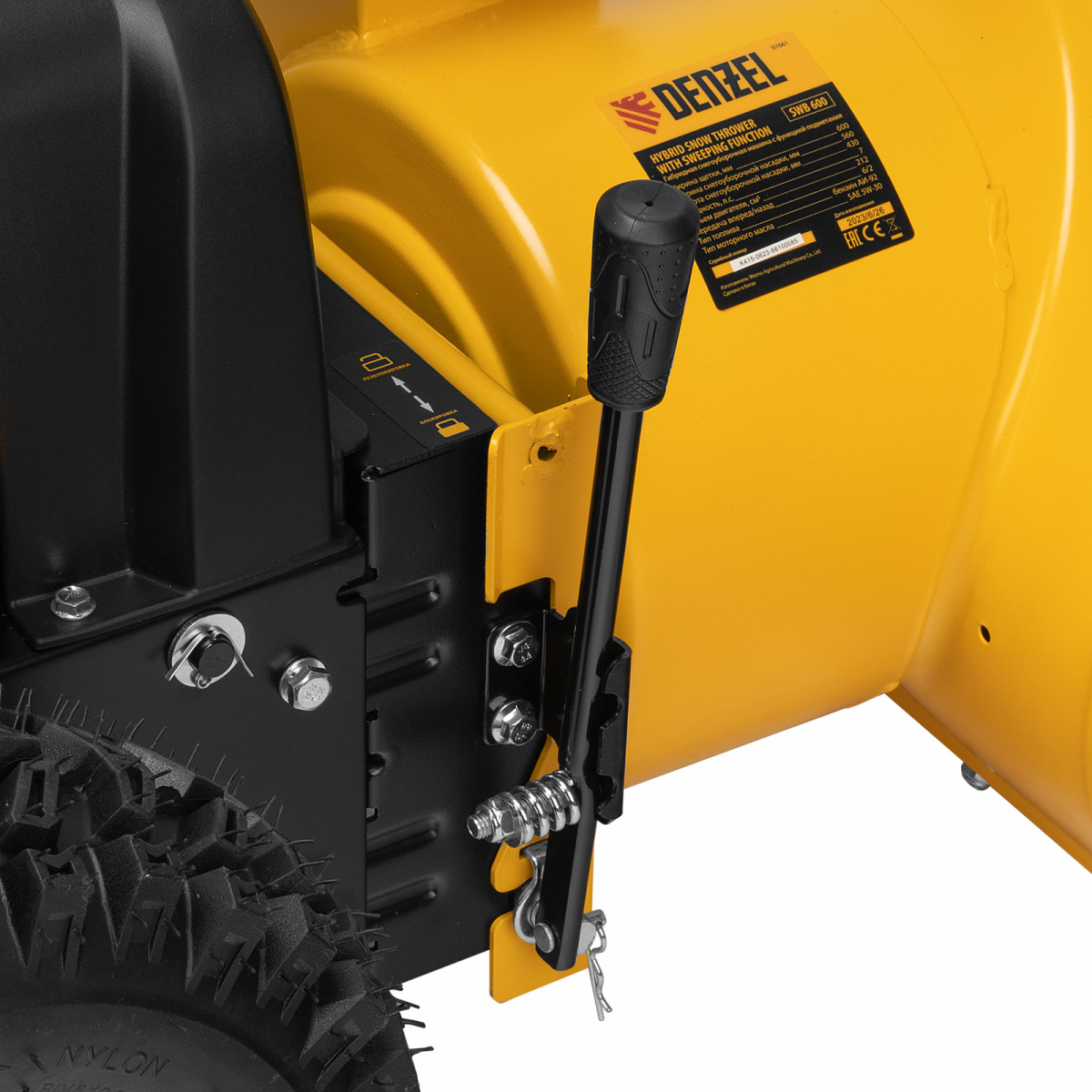 - Возможность увеличения ширины захвата 700 мм — на кожух шнека можно установить подрезатели Denzel 97102 (не входят в комплект поставки).