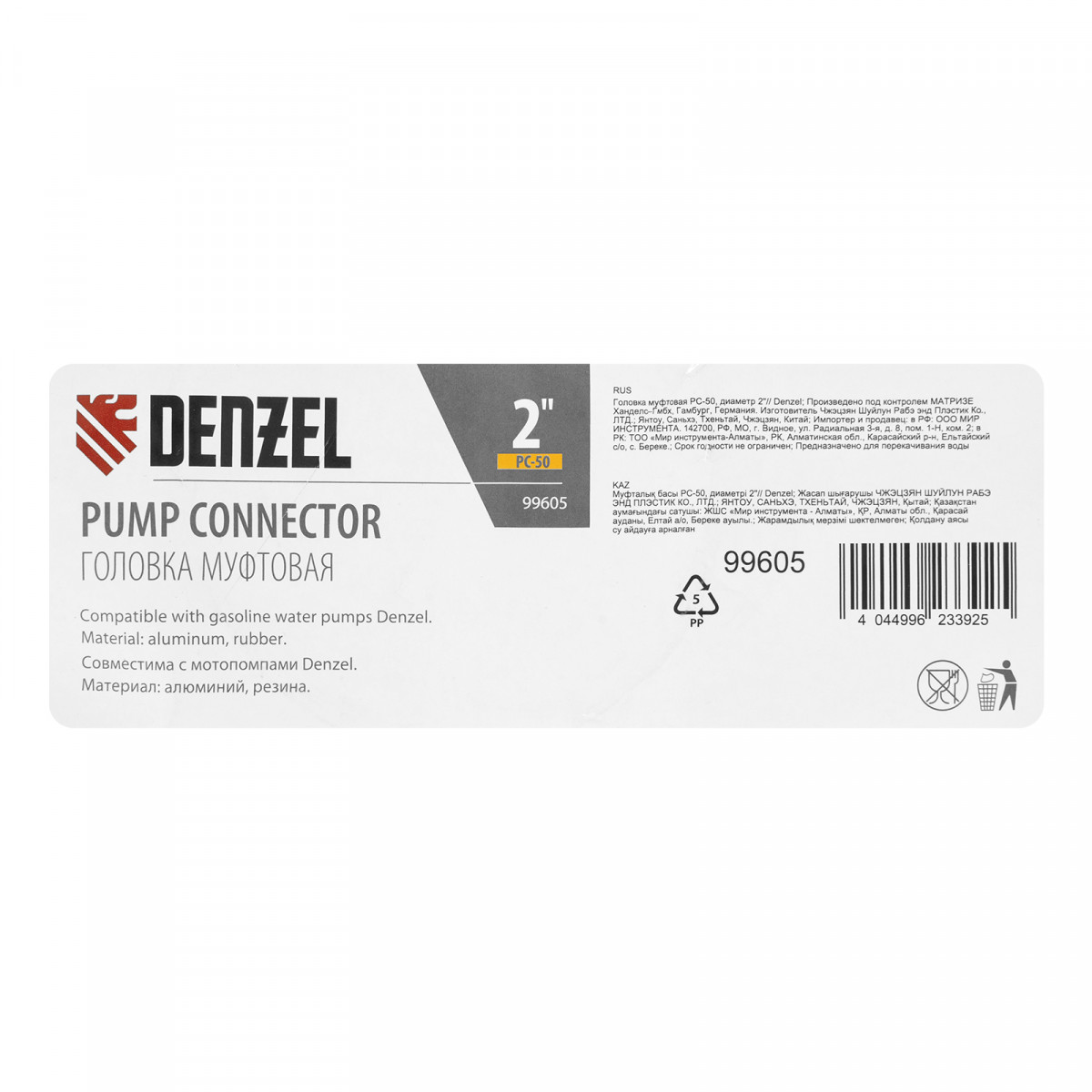 Муфтовая головка Denzel PC-50 99605 с присоединительным диаметром 2" предназначена для соединения выходного патрубка мотопомпы с напорным рукавом. Подходит к моделям Denzel 99201 и 99203. Используется для организации систем полива, водоснабжения, пожаротушения.