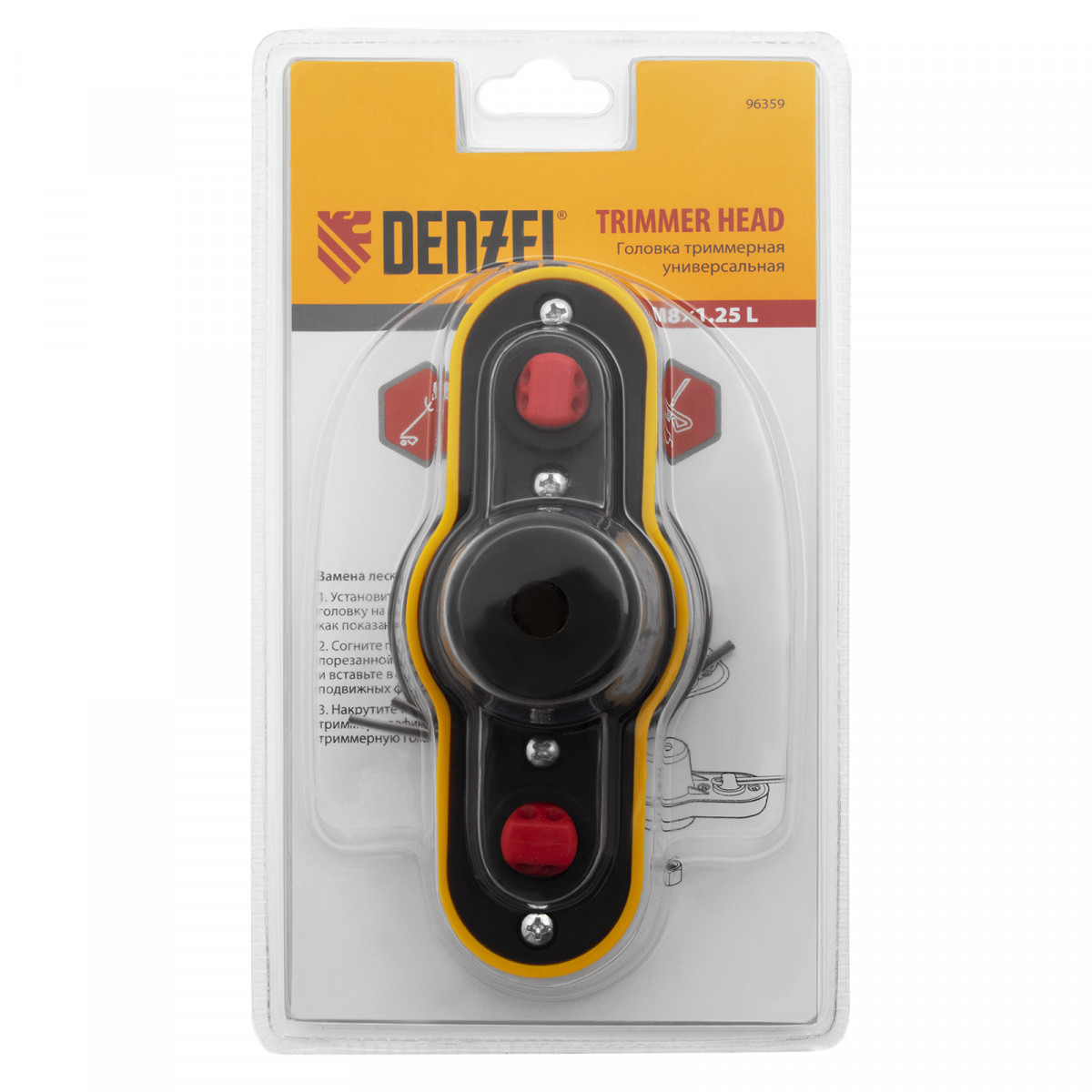 Универсальная триммерная головка Denzel 96359 с закладной гайкой М8 х 1,25 с левой резьбой подходит практически ко всем моделям электро- и бензокос. Заправляется режущей леской толщиной до 3 мм, поэтому эффективна как для подравнивания газона, так и для скашивания высоких зарослей травы.