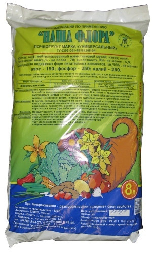 Нейтральный, универсальный, полностью готовый к употреблению грунт. Изготовлен из высококачественных торфов по уникальной технологии. Содержит полный набор питательных веществ и микроэлементов, природные разрыхлители. Предназначен для выращивания любых сельскохозяйственных и цветочных культур. Растения, высаженные в грунт «НАША ФЛОРА» хорошо приживаются, не требует дополнительной подкормки в течении 6 - 8 месяцев. Состав: азот – не менее 220 мг/100г; фосфор – не менее 200 мг/100г; калий – не менее 170 мг/100г; кислотность – не менее 6,0; влага – не более 70%.