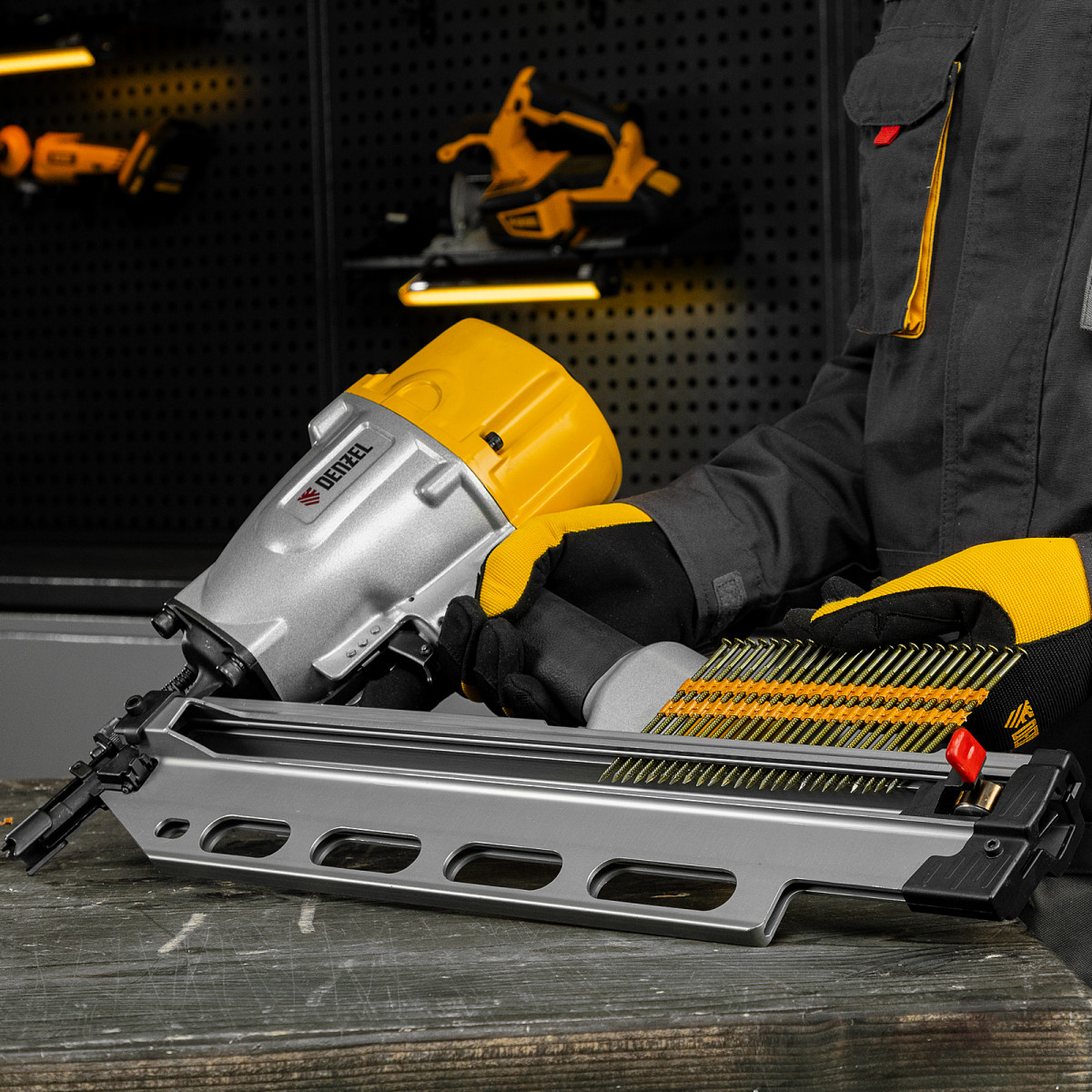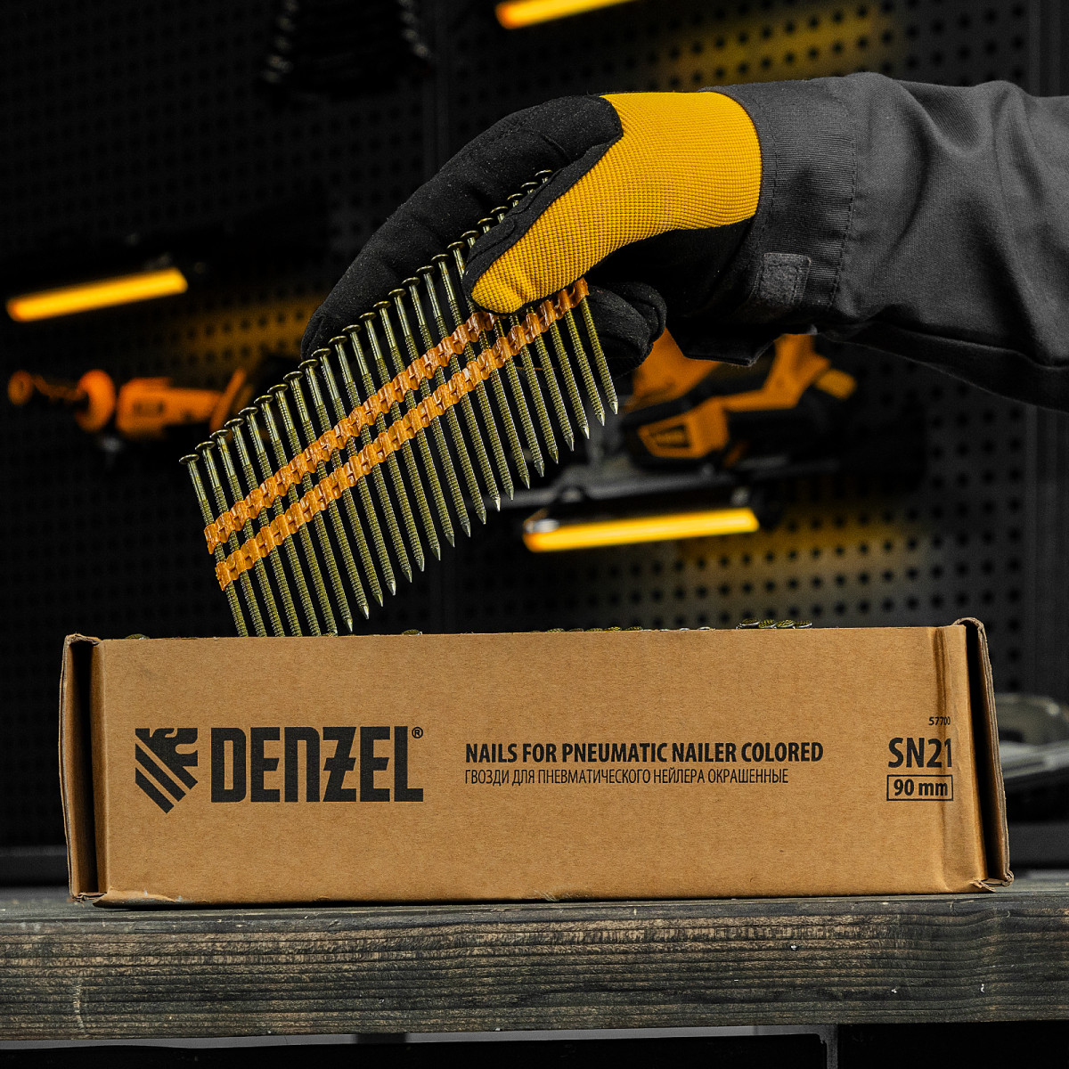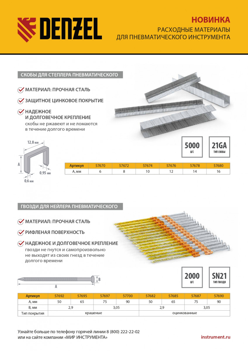 Гвозди Denzel 57700 типа SN21, длиной 90 мм и диаметром 3,05 мм, с крашеной поверхностью, 2000 шт. в упаковке, — расходники для пневматического нейлера. Используются для скрепления различных материалов, будут полезны во время сборочных и отделочных работ.