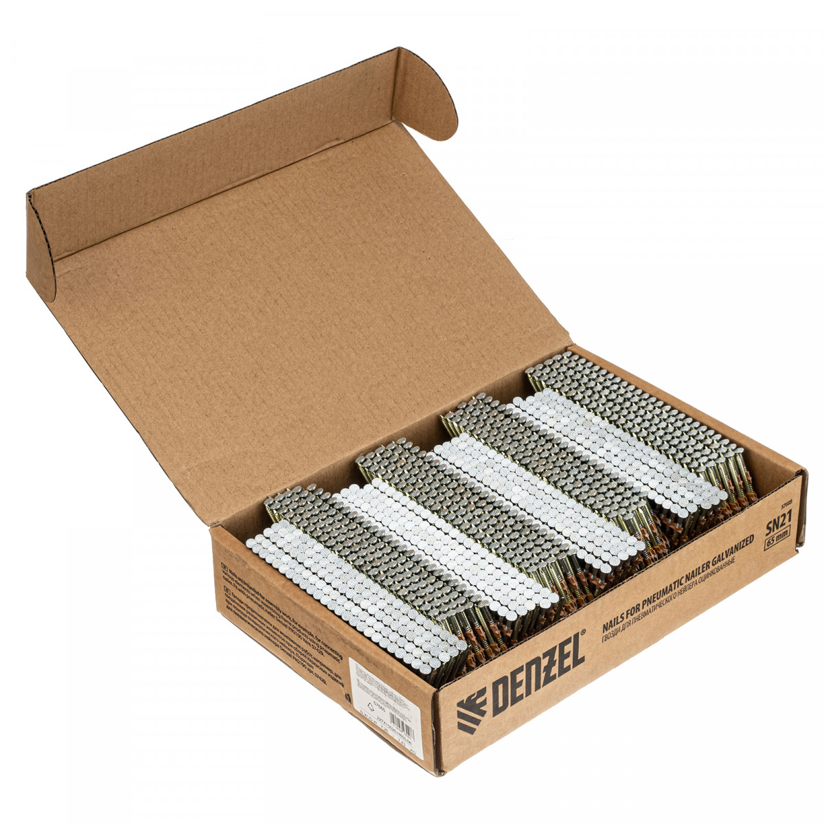 Оцинкованные гвозди Denzel 57685 типа SN21, длиной 65 мм и диаметром 2,9 мм, 2000 шт. в упаковке, — расходники для пневматического нейлера. Используются для скрепления различных материалов, будут полезны во время сборочных и отделочных работ.
