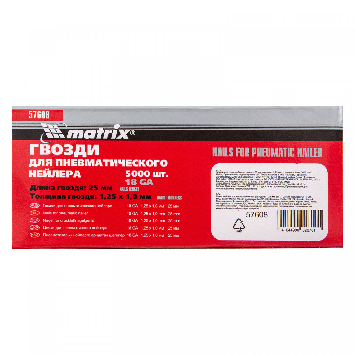Гвозди для пневматического нейлера, длина 25 мм, ширина 1.25 мм, толщина 1 мм, 5000 шт Matrix