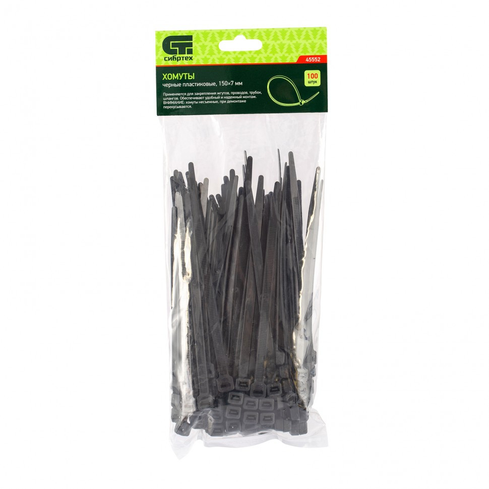 Черные пластиковые хомуты Сибртех 45552, 150 х 7 мм, 100 шт. в упаковке, используются для стяжки кабелей, закрепления трубок, шлангов, рекламных конструкций, а также для упаковки различных предметов. Пригодятся во время прокладки электрических и локальных вычислительных сетей, ремонта компьютерной техники, оформлении торговых стендов, комплектовании товара, будут также полезны дома, на даче и в гараже.
