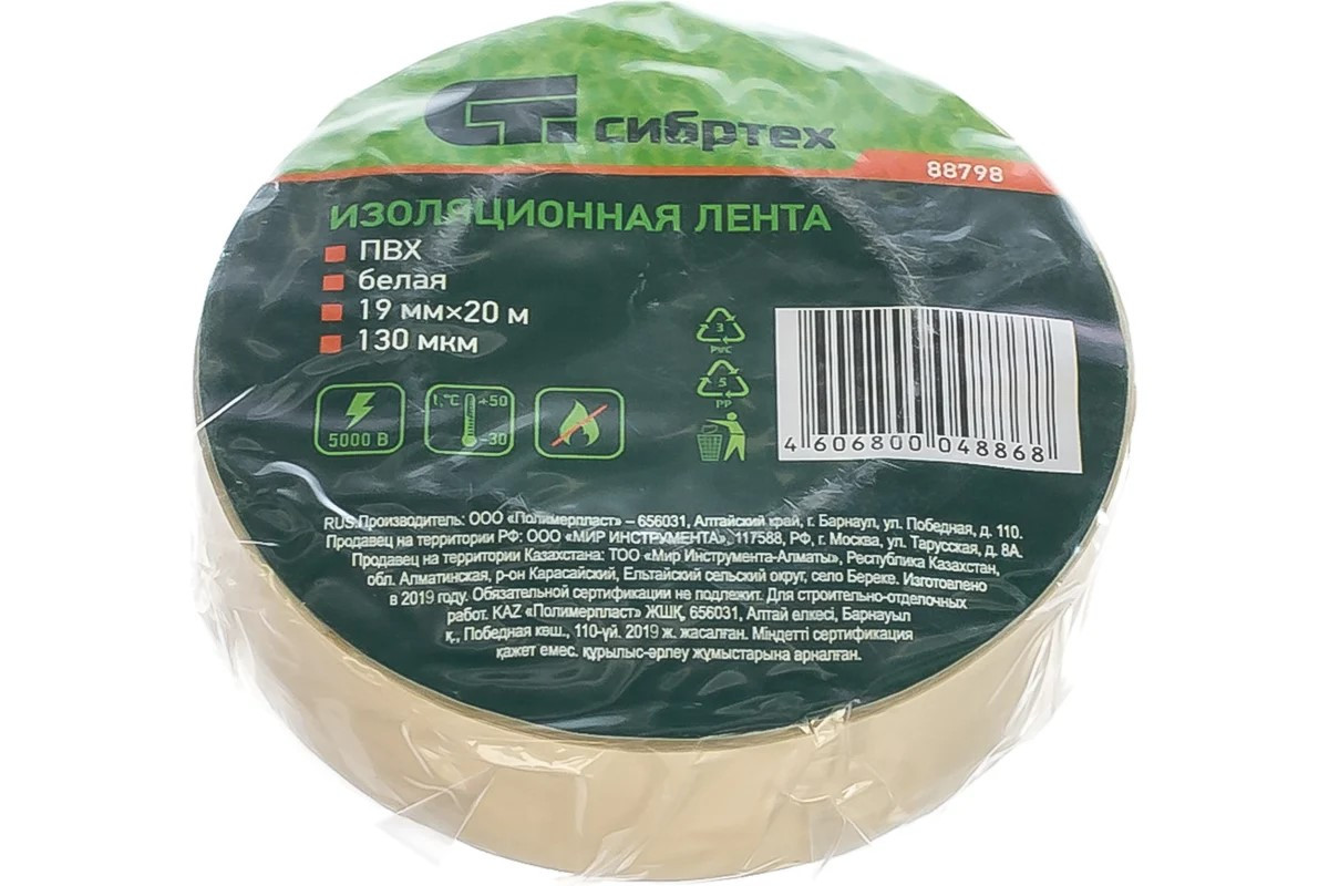 Изолента 19 мм*20 м профи ПВХ белая СИБРТЕХ