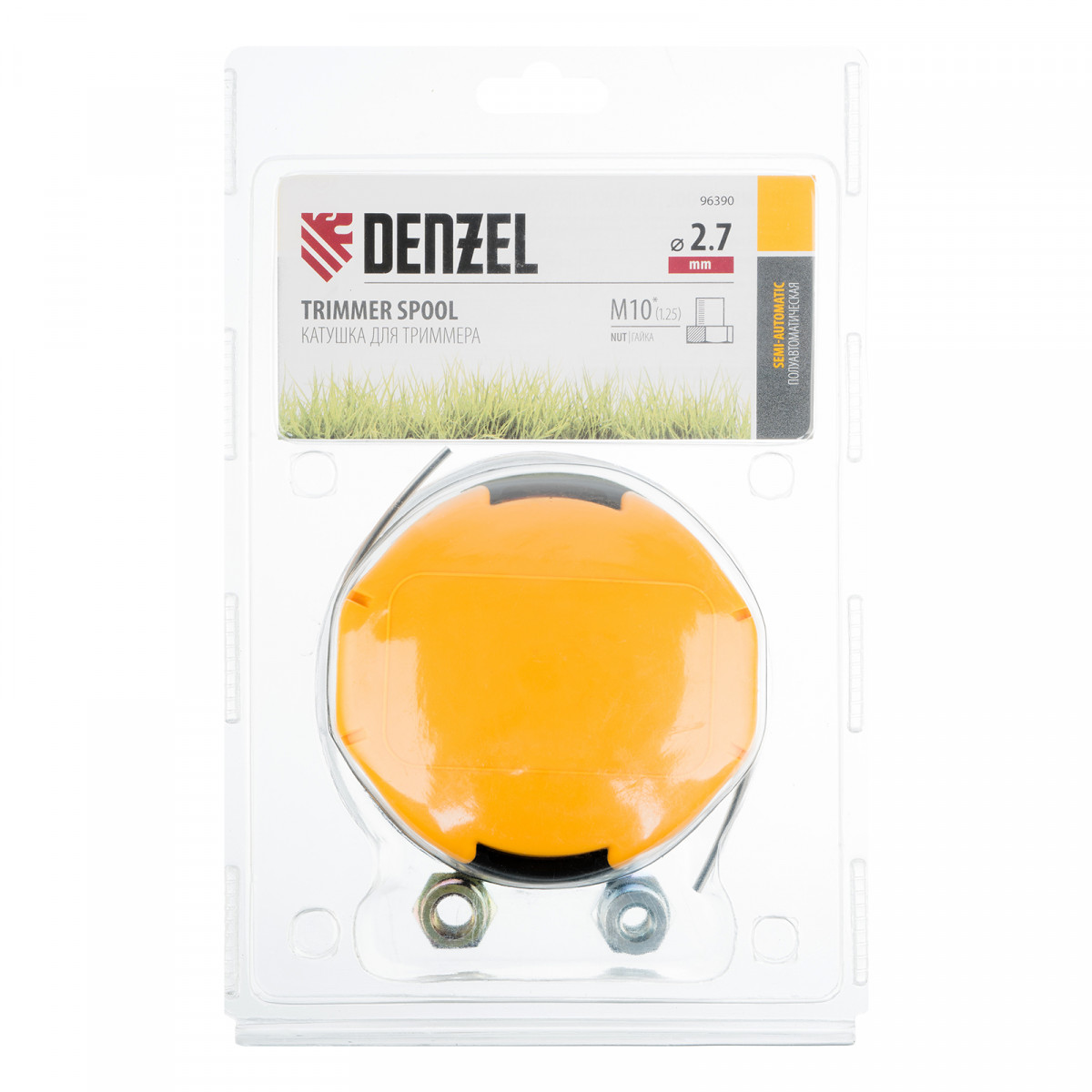 Полуавтоматическая триммерная катушка Denzel 96390 с легкой заправкой лески крепится на вал триммера при помощи гайки М10 с левой резьбой и шагом 1,25 мм, дополнительно комплектуется гайками М8 и М10 с шагом 1,25 и 1,0 мм соответственно. Заправляется леской диаметром до 2,7 мм, устанавливается на вал бензо- или электротриммера и используется для скашивания газонной травы, а также для удаления сорняков.
