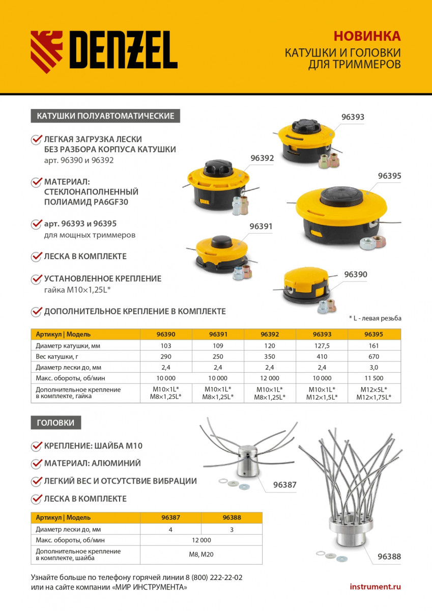 Полуавтоматическая триммерная катушка Denzel 96392 с легкой заправкой лески крепится на вал триммера при помощи гайки М10 с левой резьбой и шагом 1,25 мм, дополнительно комплектуется гайками М8 и М10 с шагом 1,25 и 1,0 мм. Заправляется леской диаметром до 2,7 мм, устанавливается на вал бензо- или электротриммера и используется для скашивания газонной травы, а также для удаления сорняков.