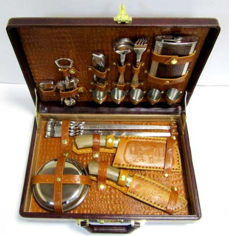 Внутренняя отделка кейса – натуральная кожа.Фляга – 1 шт. 9 унц.Нож складной – 1 шт.Нож туристический – 1 шт. в кожаном чехле.Тяпка – 1 шт. нержавеющая сталь в кожаном чехле.Зажигалка – 1 шт.Штопор – 1 шт.Рюмки – 5 шт. нержавеющая сталь.Вилки – 5 шт.Ложки – 5 шт.Тарелки – 5 шт.Шампура – 5 шт.