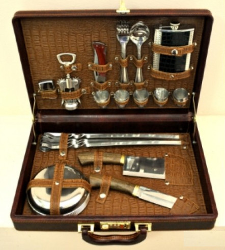 Внутренняя отделка кейса – Кож.зам.Фляга – 1 шт. 9унц.Нож складной – 1 шт.Нож туристический – 1 шт. в кожаном чехле.Тяпка – 1 шт. нержавеющая сталь в кожаном чехле.Зажигалка – 1 шт.Штопор – 1 шт.Рюмки – 5 шт. нержавеющая сталь.Вилки – 5 шт.Ложки – 5 шт.Тарелки – 5 шт.Шампура – 5 шт.