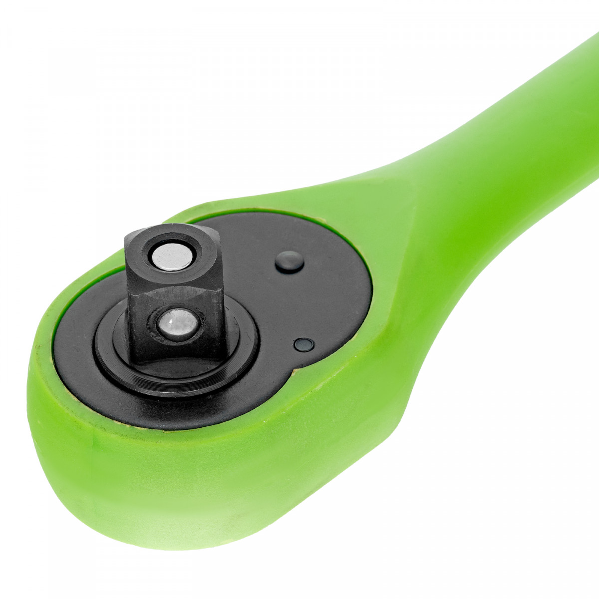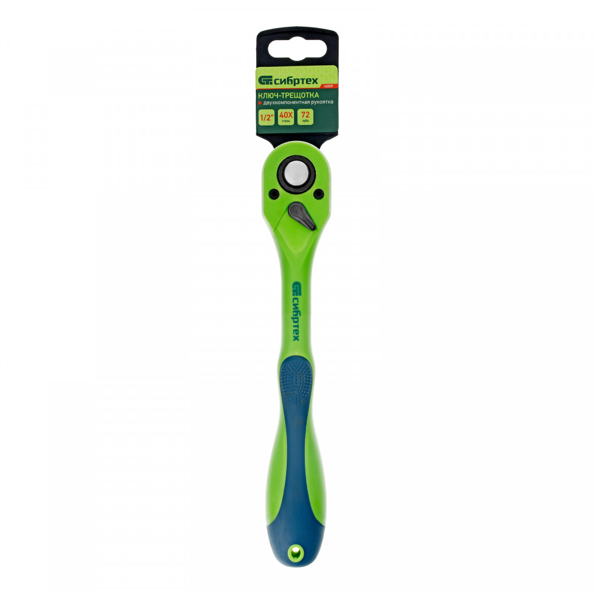 Ключ-трещотка Сибртех 14009 с двухкомпонентной рукояткой и присоединительным квадратом 1/2" используется с торцевыми головками, имеющими посадочное гнездо соответствующего размера. Предназначен для закручивания и раскручивания резьбовых соединений. Храповой механизм с 72 зубцами обеспечивает плавное вращение. Ключ применяется для ремонта автомобилей, техники и оборудования, а также пригодится дома или на даче.