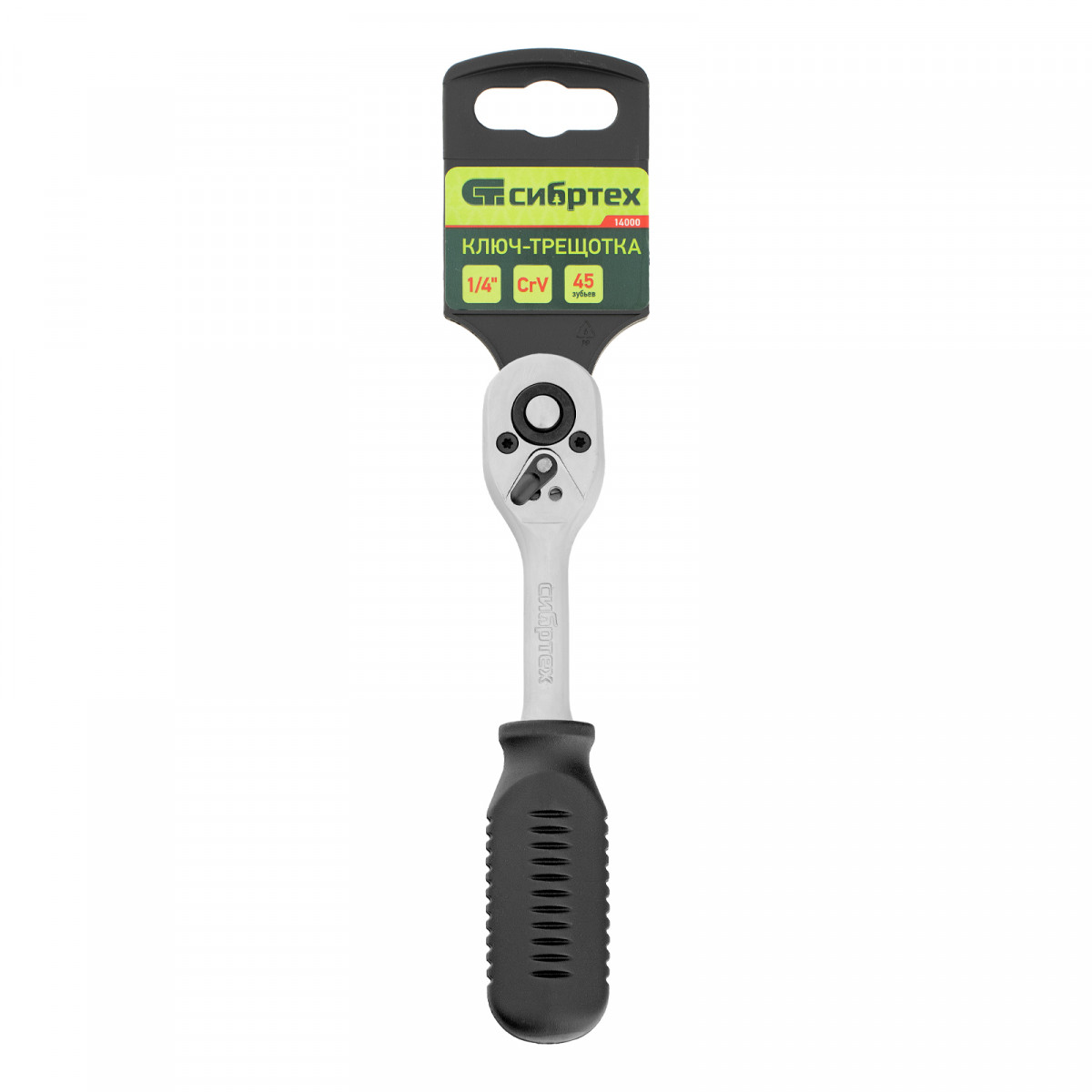 Хромированный ключ-трещотка Сибртех 14000 из стали CrV, с посадочным размером 1/4″ и 45-зубым храповым механизмом, с функцией быстрого сброса, используется для работы с резьбовым крепежом. Трещоточный механизм с 45 зубьями обеспечивает плавное вращение, облегчая работу. Инструмент пригодится дома, в мастерской и гараже.