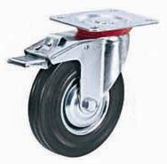 Колесная опора поворотная с тормозом, обод - прессованный из листовой стали, шинка - литая черная резина, платформенное крепление, роликоподшипник.