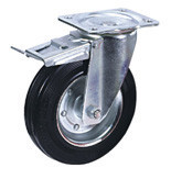 Колесные опоры промышленные усиленные поворотные с тормозом, обод - прессованный из листовой стали, оцинкован, шинка из полуэластичной черной резины, платформенное крепление, толщина металла кронштейна для диаметров колес 160 и 200 мм - 3,5 мм, роликоподшипник.