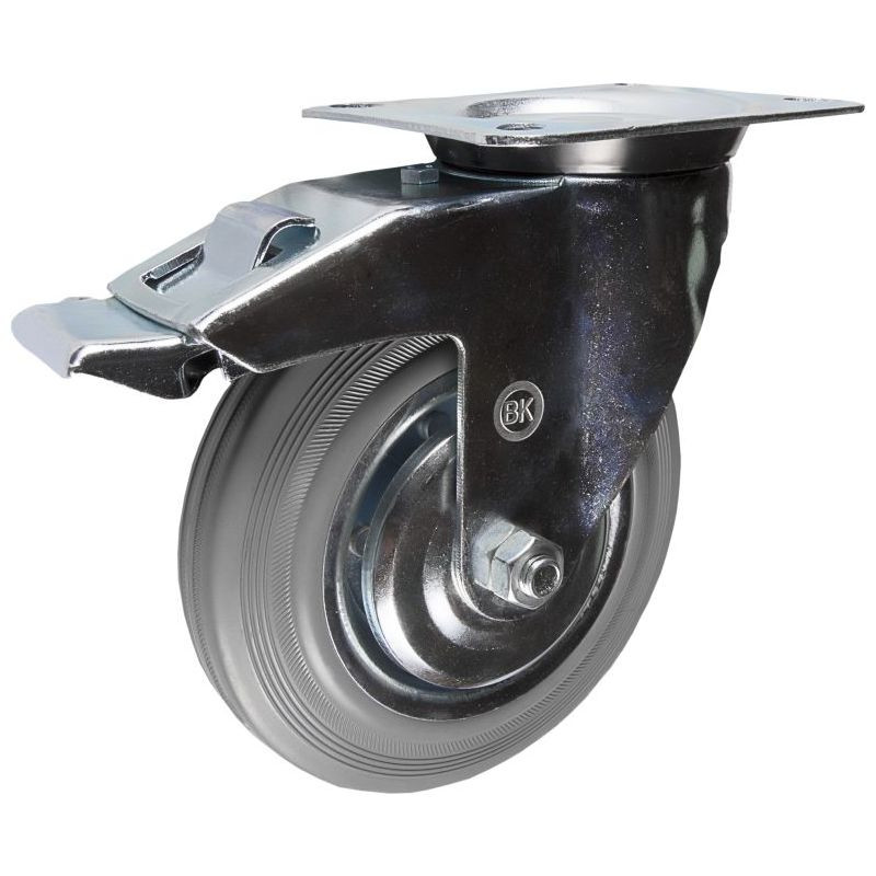 Колесные опоры промышленные поворотные с тормозом, платформенное крепление. Шинка из полуэластичной серой резины, обод прессованный из листовой стали.