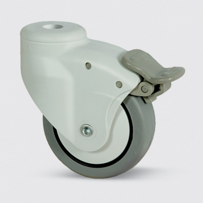 Поворотный ролик с замком и колесом, корпус изготовлен из полиамида. Колесный центр из полипропилена, протектор из термопластичной резины, серый без маркировки, с резьбовой защитой, подшипником скольжения, с отверстием для крепления мебельных роликов.