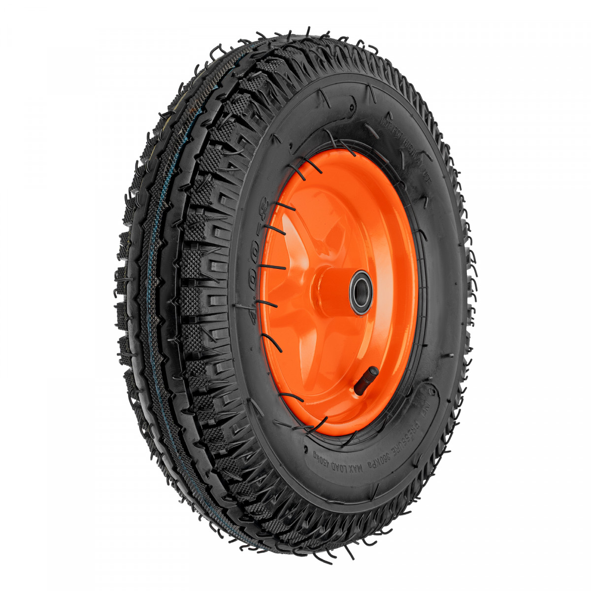 Пневматическое колесо 4.00-8 Palisad 69081 диаметром 400 мм, с усиленной шиной 8PR, на подшипниках, с длиной оси 90 мм и посадочным диаметром 20 мм, устанавливается на тачки для перемещения грузов, например, Palisad 68923, 689233, 68937, Сибртех 689643. Усиленная восьмислойная шина подходит как для садовых, так и для строительных тачек. Стальные шариковые подшипники обеспечивают плавный ход и возможность передвижения по неровной поверхности.