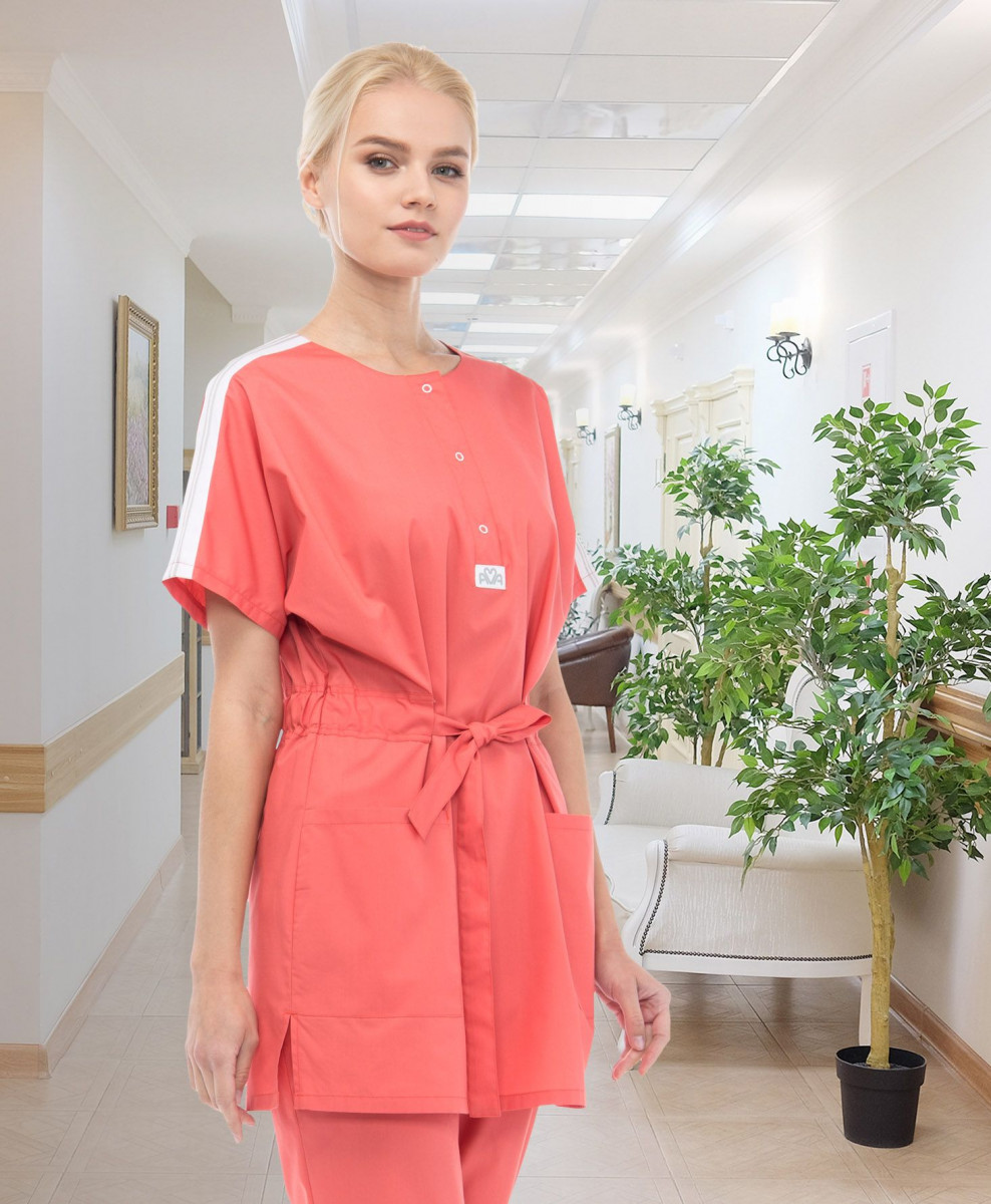 Комплект из блузы и брюк. Блуза-туника удлиненная прямого силуэта с цельнокроеными короткими рукавами. Застежка на планку с кнопками спереди. На плечах отделка из широкой тесьмы. В нижней части блузы накладные карманы. По талии спинки эластичная кулиса на резинке. По талии переда полупояса для регулировки объема. По низу блузы, по бокам, небольшие разрезы. Брюки прямого силуэта, с эластичным поясом и боковыми карманами.