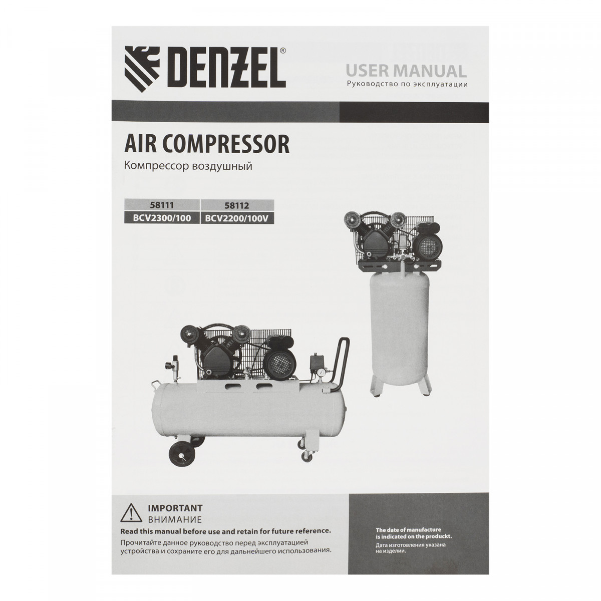 Компрессор воздушный BCV2300/100, ременный привод, 2.3 кВт, 100 литров, 440 л/мин Denzel