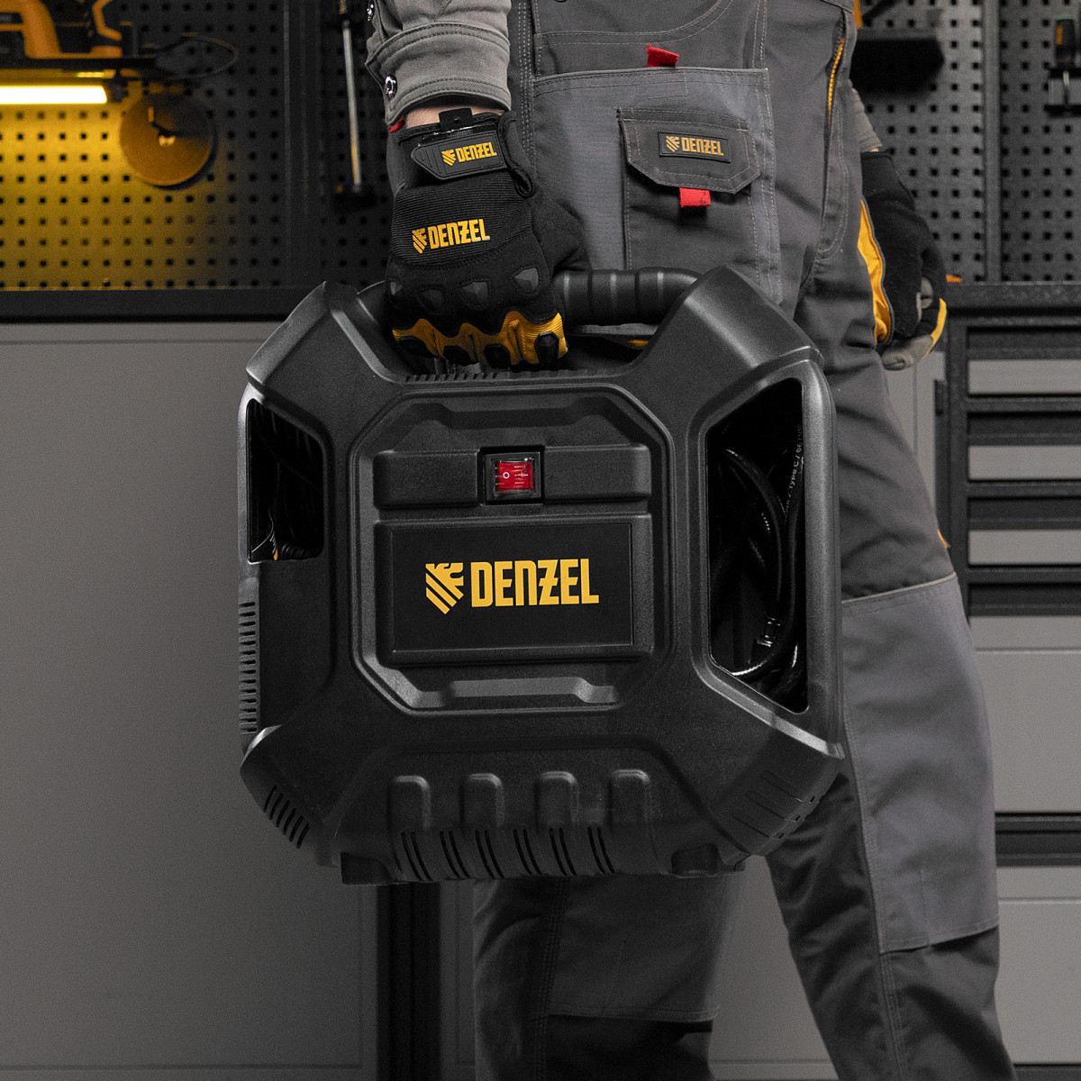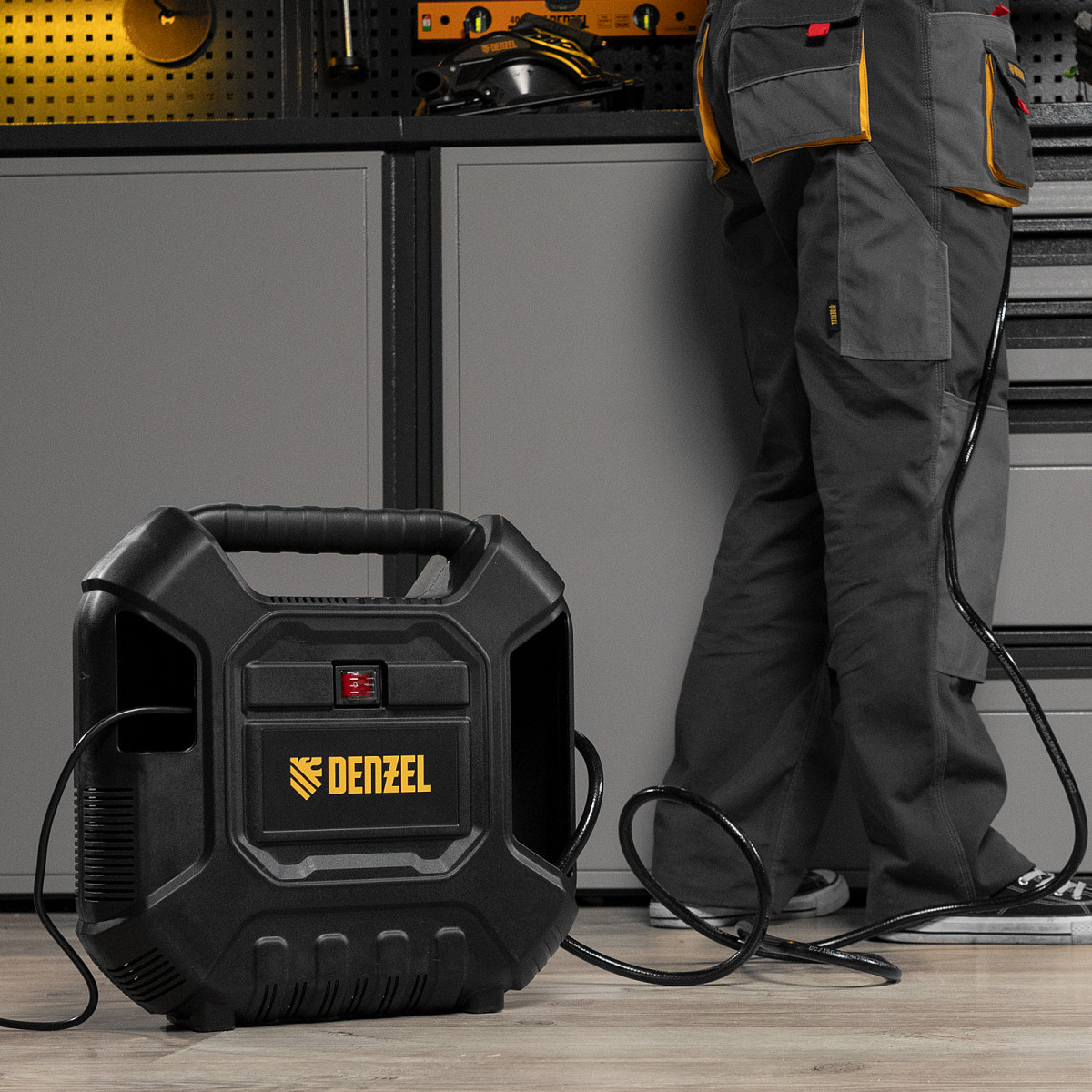 • Компактность — в компрессоре предусмотрены отсеки для кабеля питания, аксессуаров и пневмопистолета со шлангом. Такое решение позволяет аккуратно расположить комплектующие в одном месте и с удобством переносить оборудование.