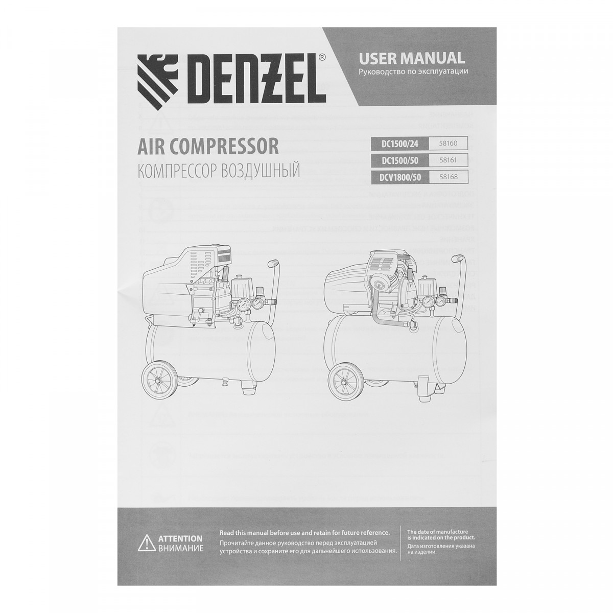 Компрессор воздушный, прямой привод DC1500/50, 1.5 кВт, 50 литров, 220 л/мин Denzel