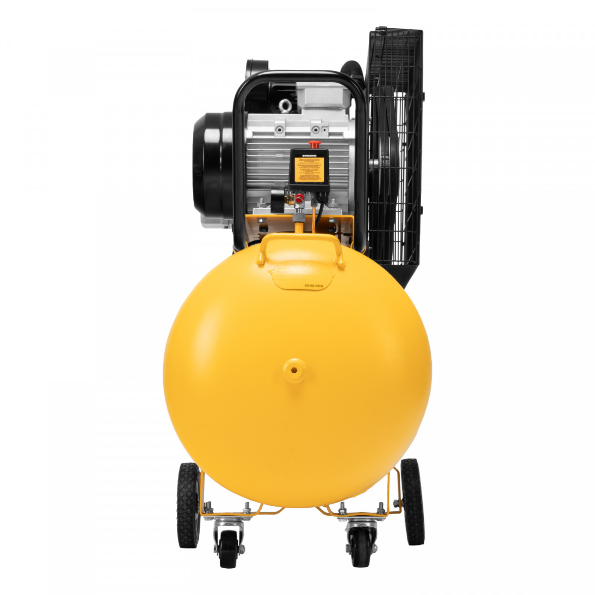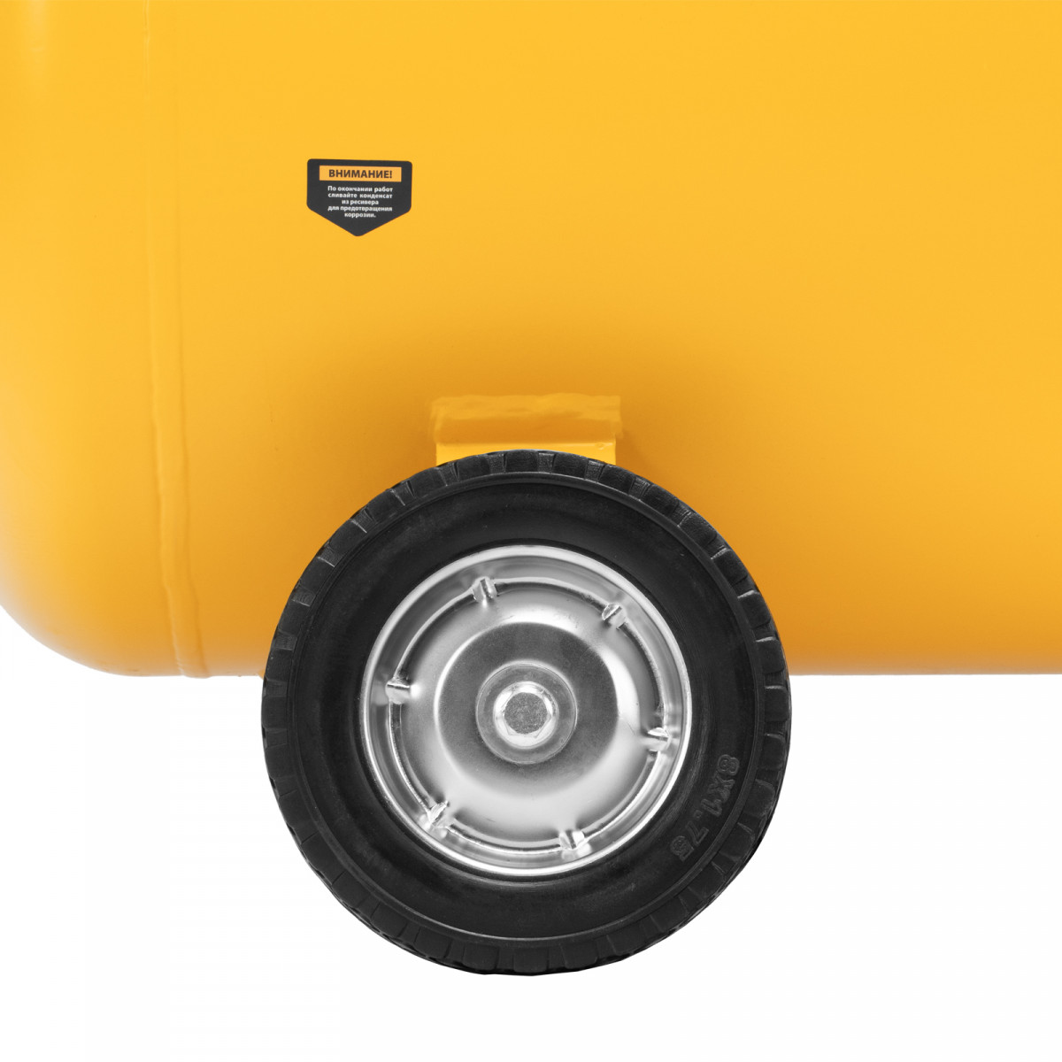 - Удобная транспортировка — на компрессоре установлены колеса, в т. ч. поворотные, и П-образная рукоятка.