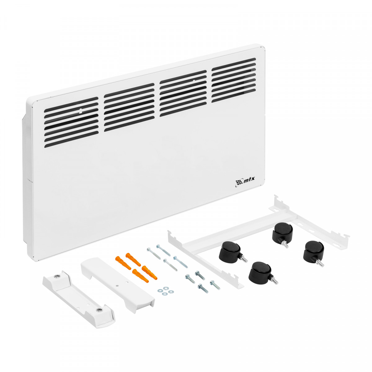 • Два варианта монтажа — конвектор можно расположить на полу или повесить на стену (колесные пары и кронштейн входят в комплект поставки).